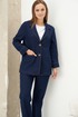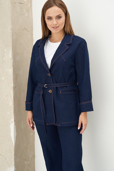 Жакет свободного упрямлённого силуэта, втачного покроя с заниженной линией плеча, воротник классический, английский. Застёжка центральная на петли и пуговицы. Полочка с прорезным карманом с листочкой и нагрудной вытачкой. Рукав двухшовный с цельнокроенной отложной манжетой. Спинка со средним швом и отрезным бочком. Длина жакета около 68 см, длина рукава с плечом около 74 см.