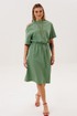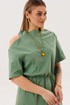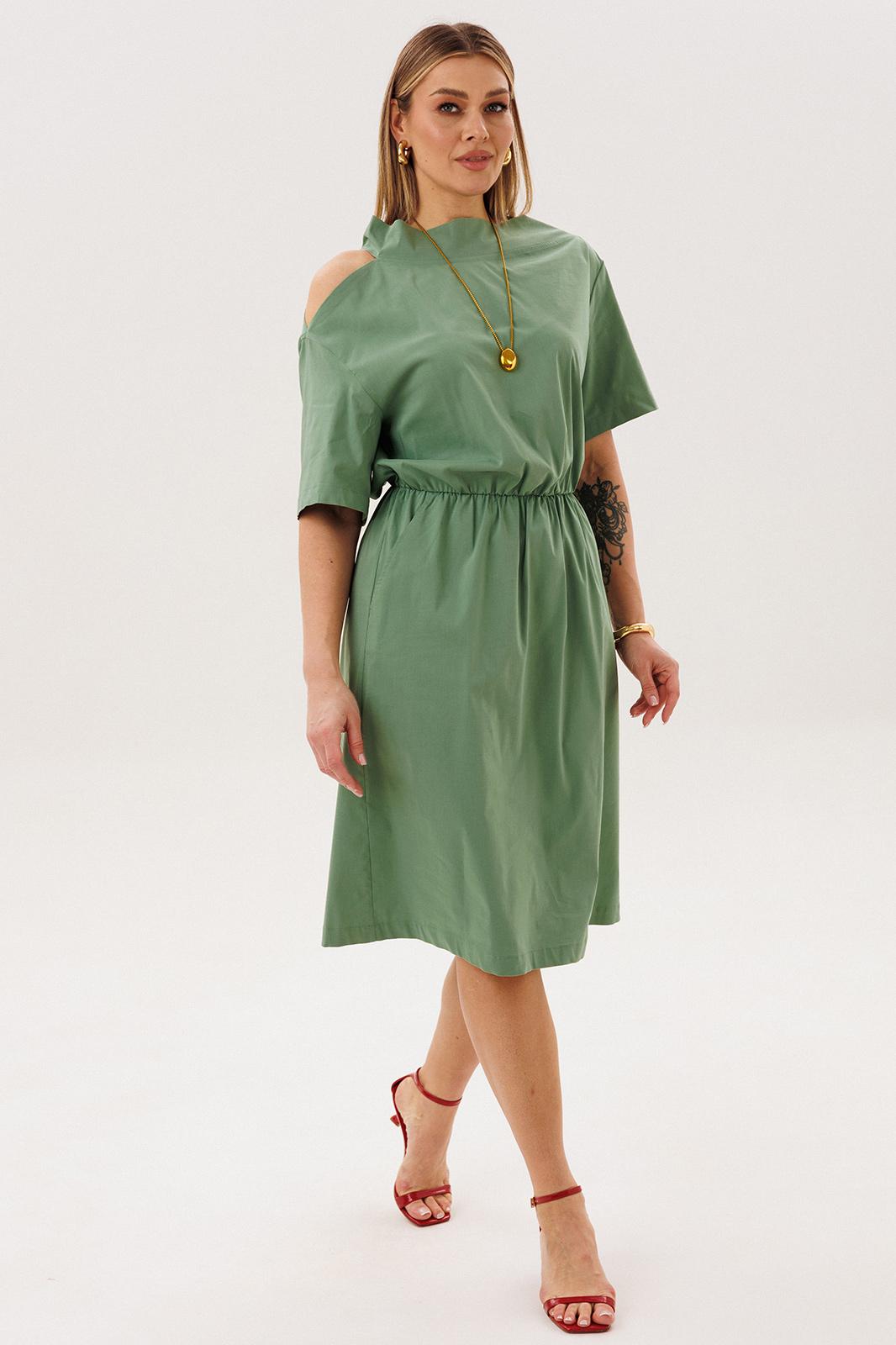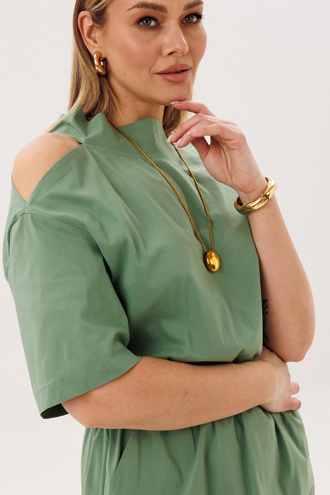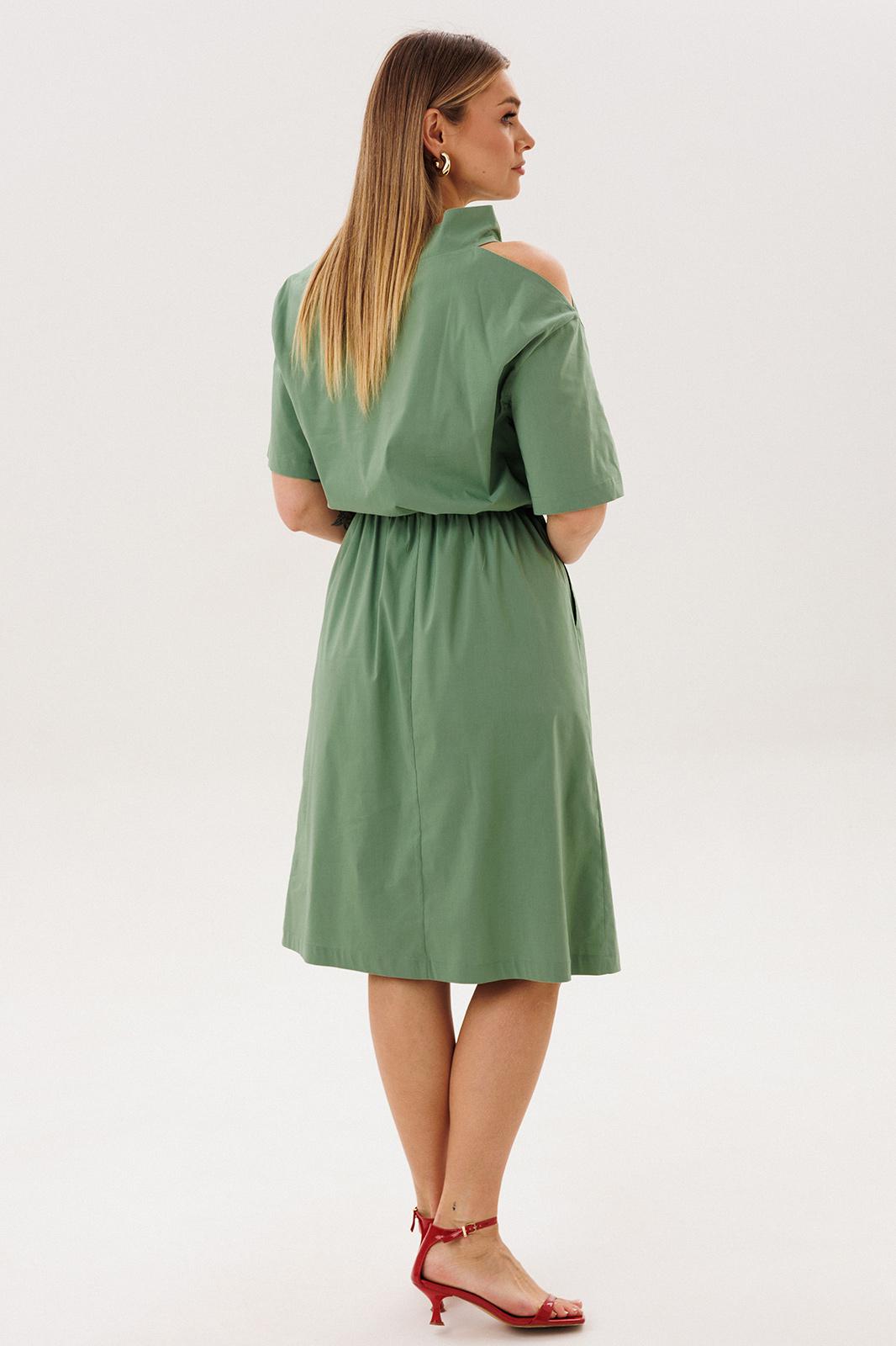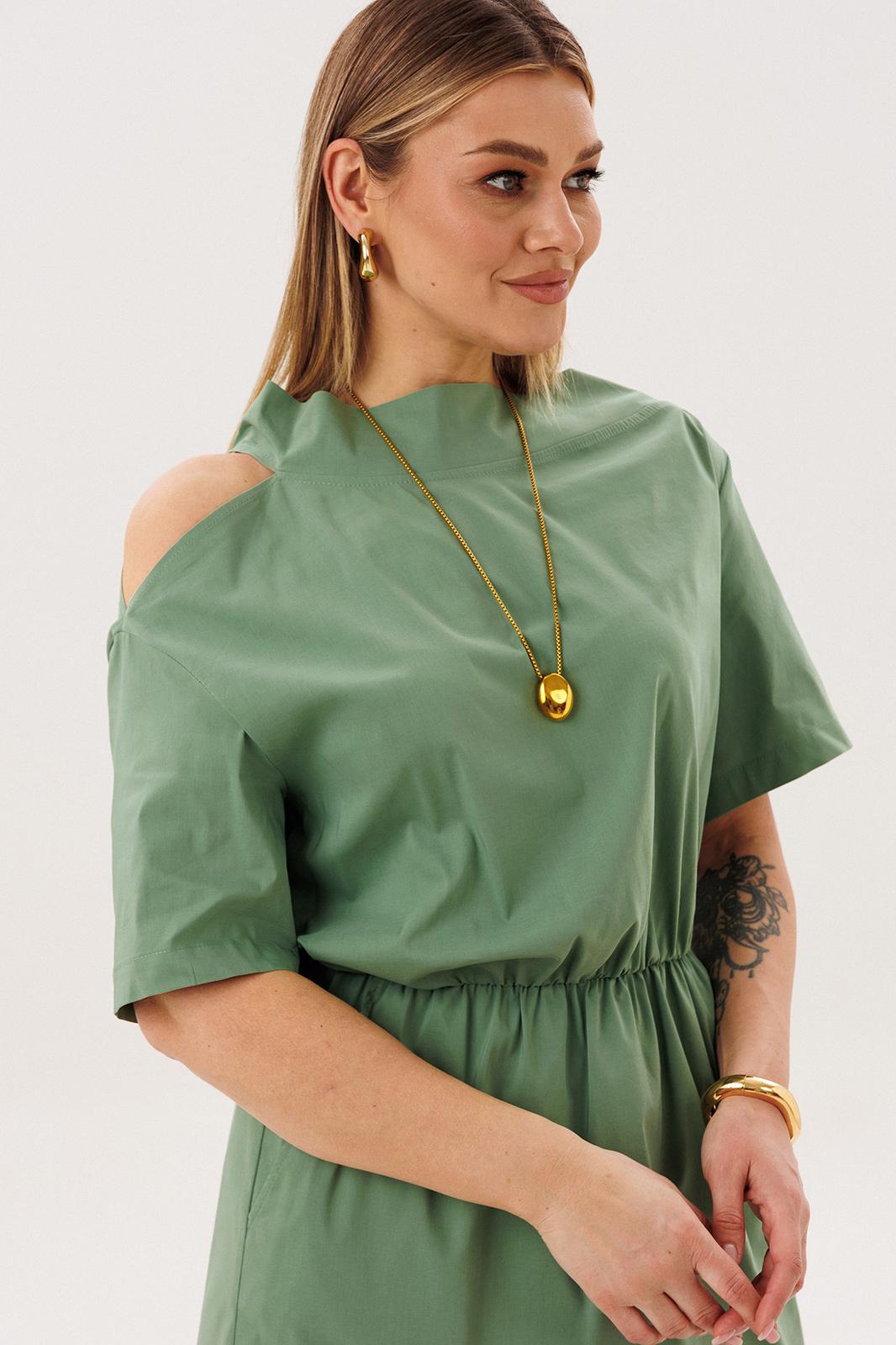 Свободный А-образный силуэт, рубашечный покрой, ассиметричная горловина, изысканный открытый участок плеча, эластичная тесьма по линии талии, съёмный пояс на полукольцах.