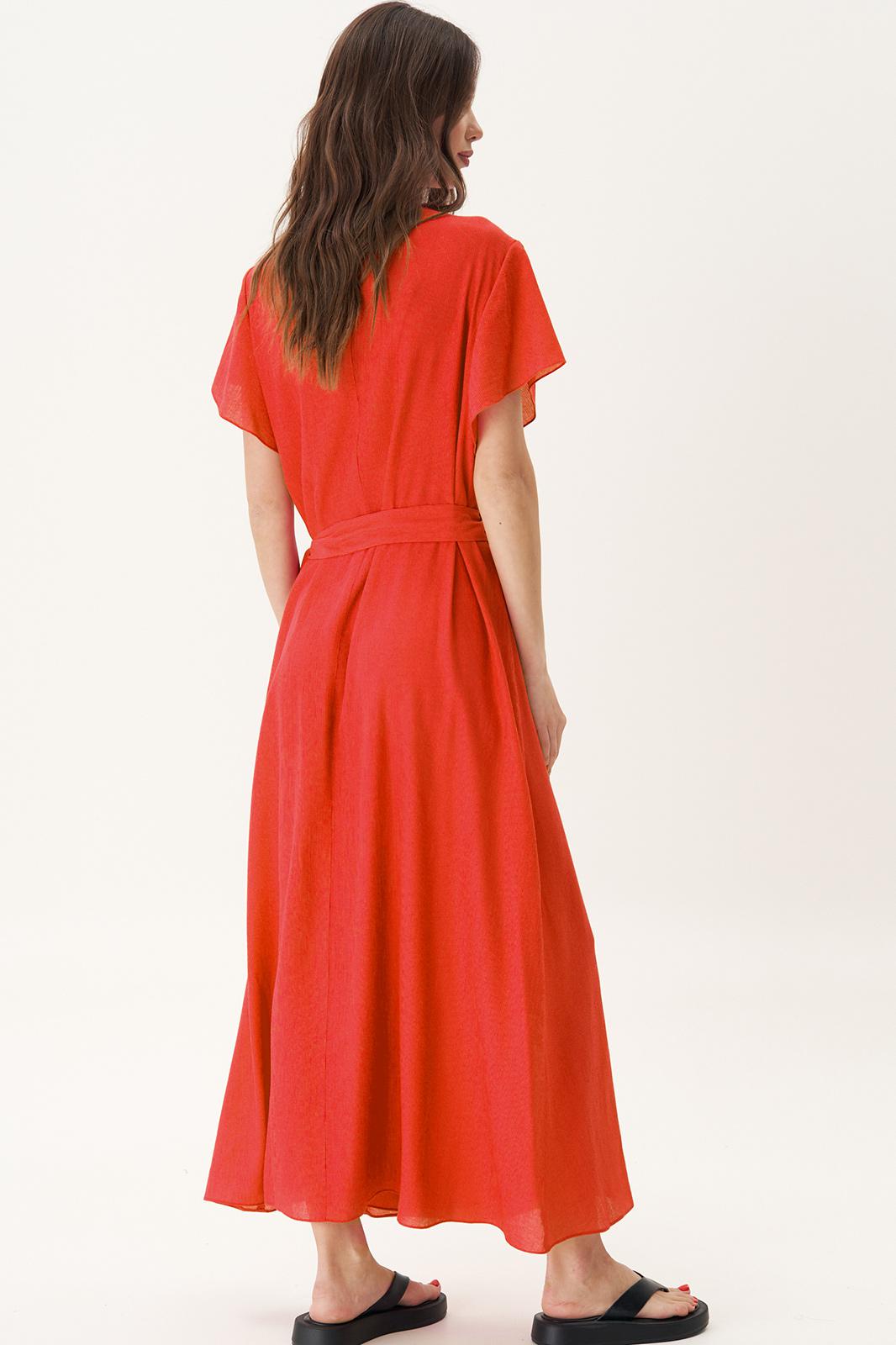 Свободный А-силуэт, рукав - крылышки. Полочка с отрезным лифом, с нагрудной вытачкой, втачным поясом и конической нижней частью. Спинка со средним швом.