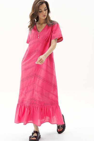 Лето, жара и платье с геометрической вышивкой из необыкновенно деликатного хлопкового батиста. Не слишком броское, но запоминающееся, оно выделяет вас из толпы, но делает это ненавязчиво. Свободный силуэт, втачной покрой, V-образный вырез горловины. Полочка с отрезным верхом с лёгкой сборкой в области рук. Нижняя часть платья выкроена под углом 45 градусов и эффектно соединяется по центру. Спинка с центральным швом, оригинальным подрезом и нижней частью сходящейся под углом 45 градусов. По низу платья эффектный волан.