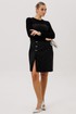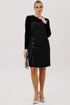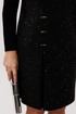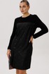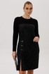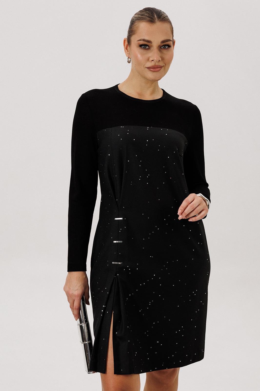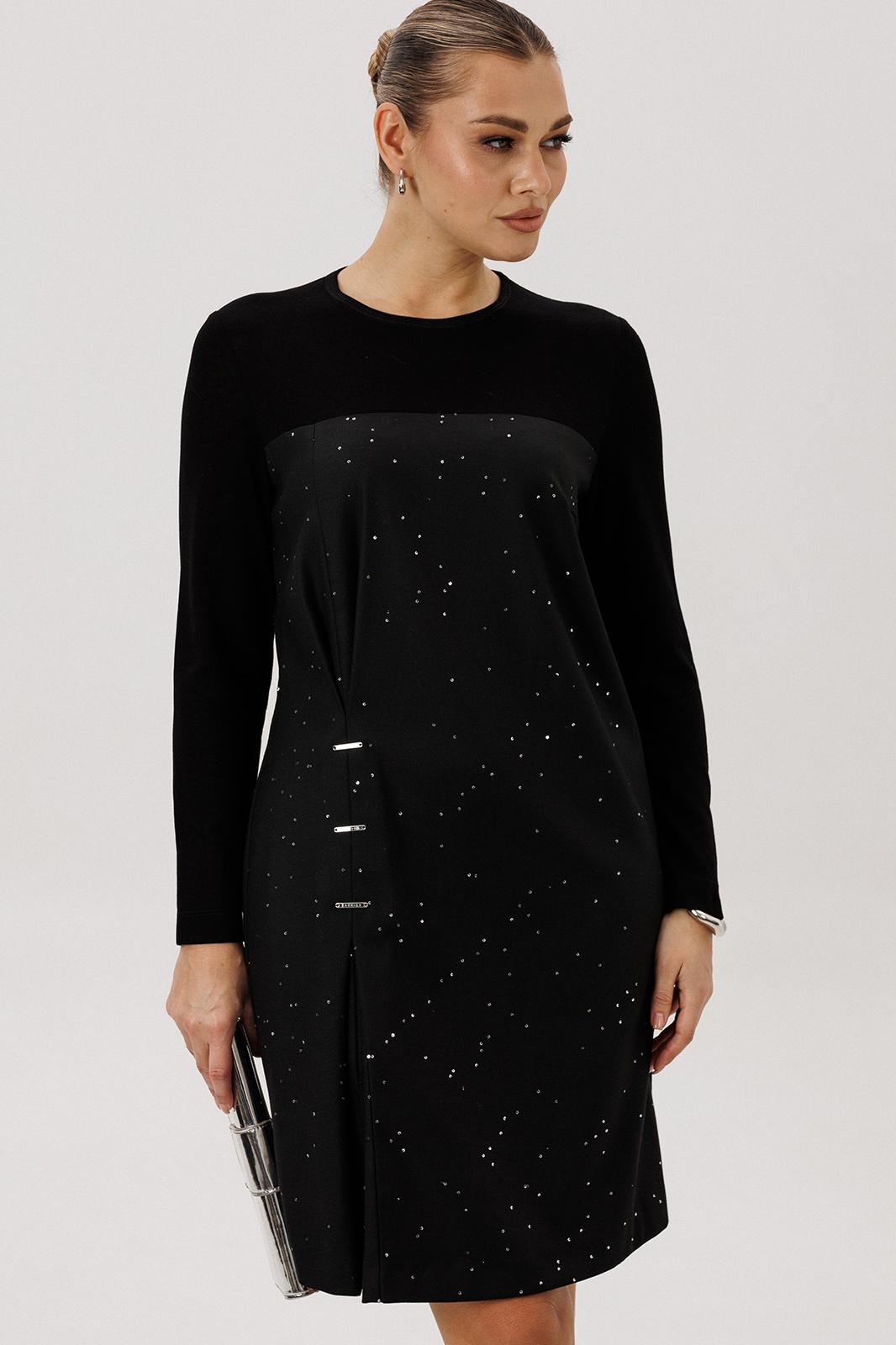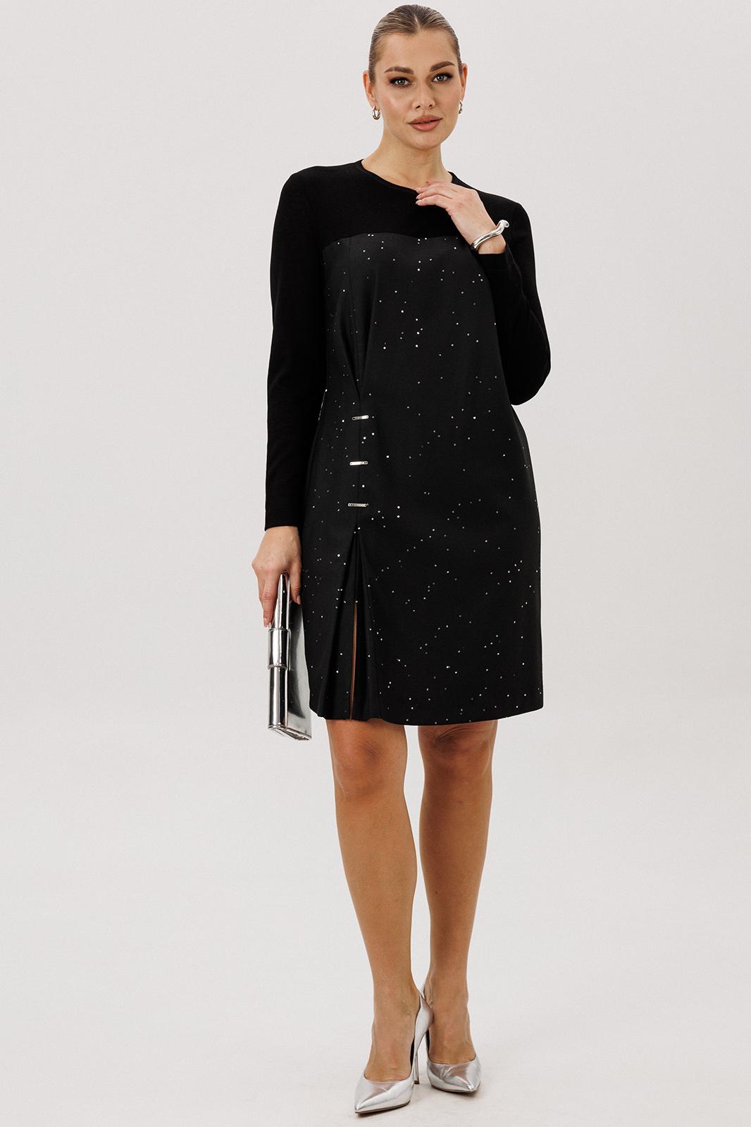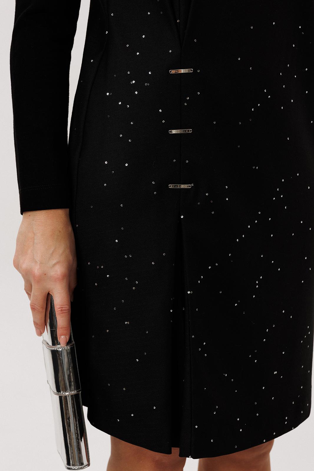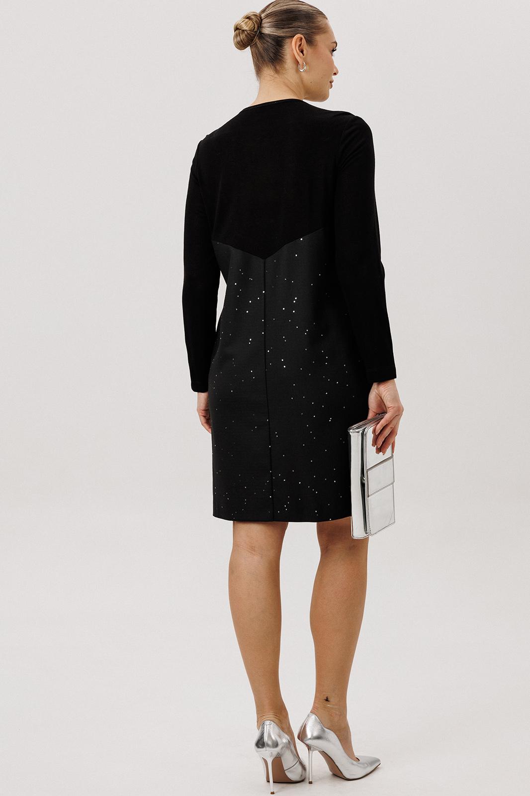 Свободный упрямлённый силуэт, втачной рукав, круглая горловина. Полочка с отрезной кокеткой, ассиметричным рельефом со встречной складкой и разрезом, нагрудной вытачкой. Спинка с центральным швом и отрезной фигурной кокеткой. Рукав зауженный, длинный. Кокетка полочки, спинка и рукава - из мягкого вискозного фактурного трикотажа. Полочка и спинка - из эффектного поливискозного полотна с лёгким вкраплением пайетки.