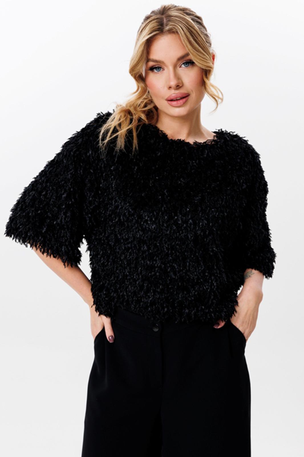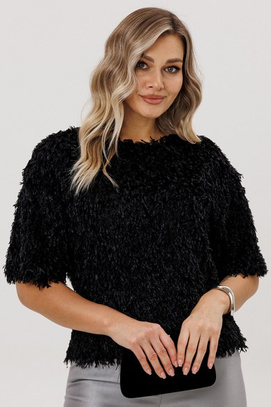 - Тип ткани: Состав: П/Э 95%, спандекс 5% Тип ткани: фактурный трикотаж с длинным ворсом, имитирующим перья