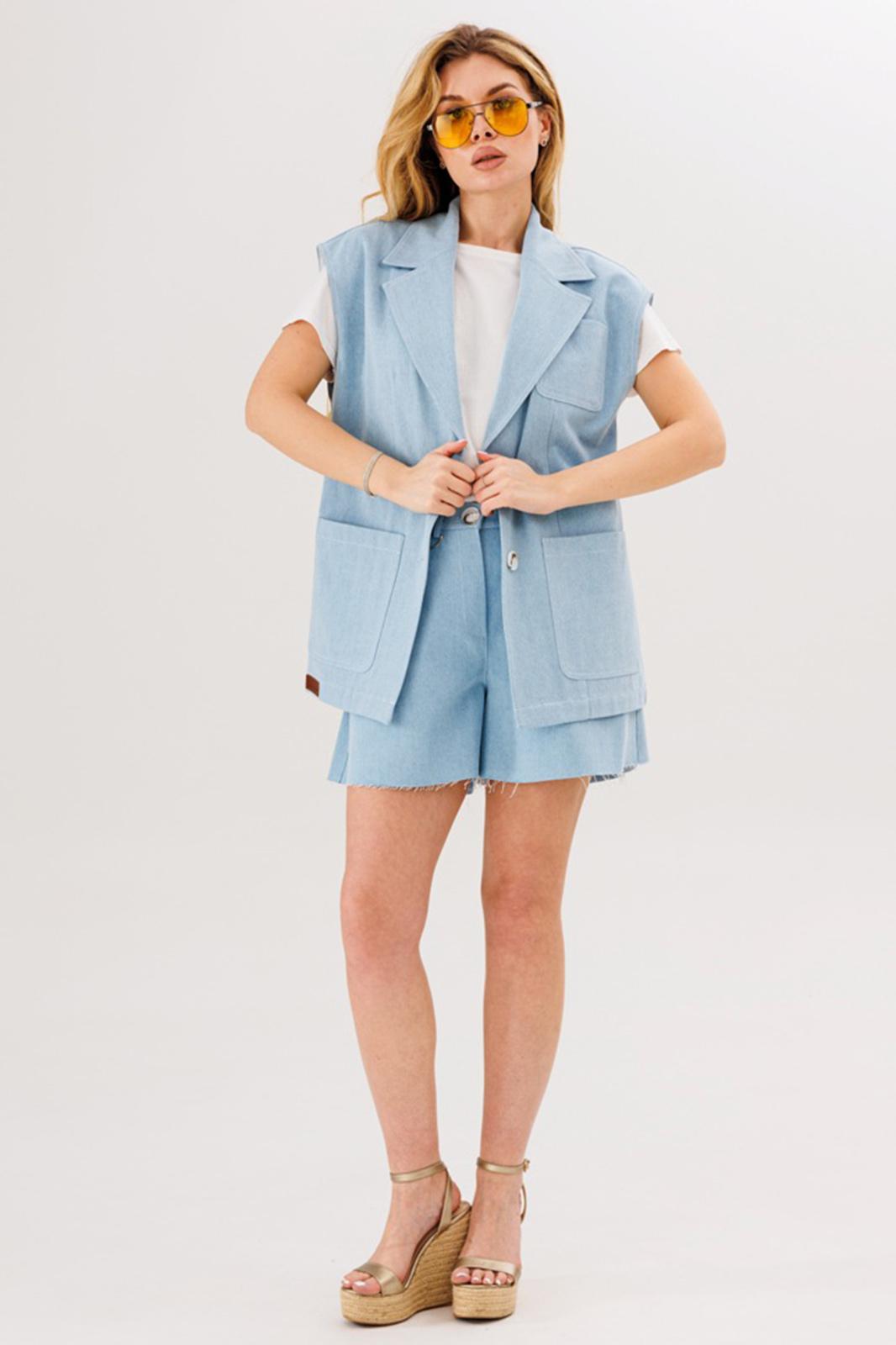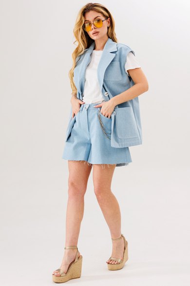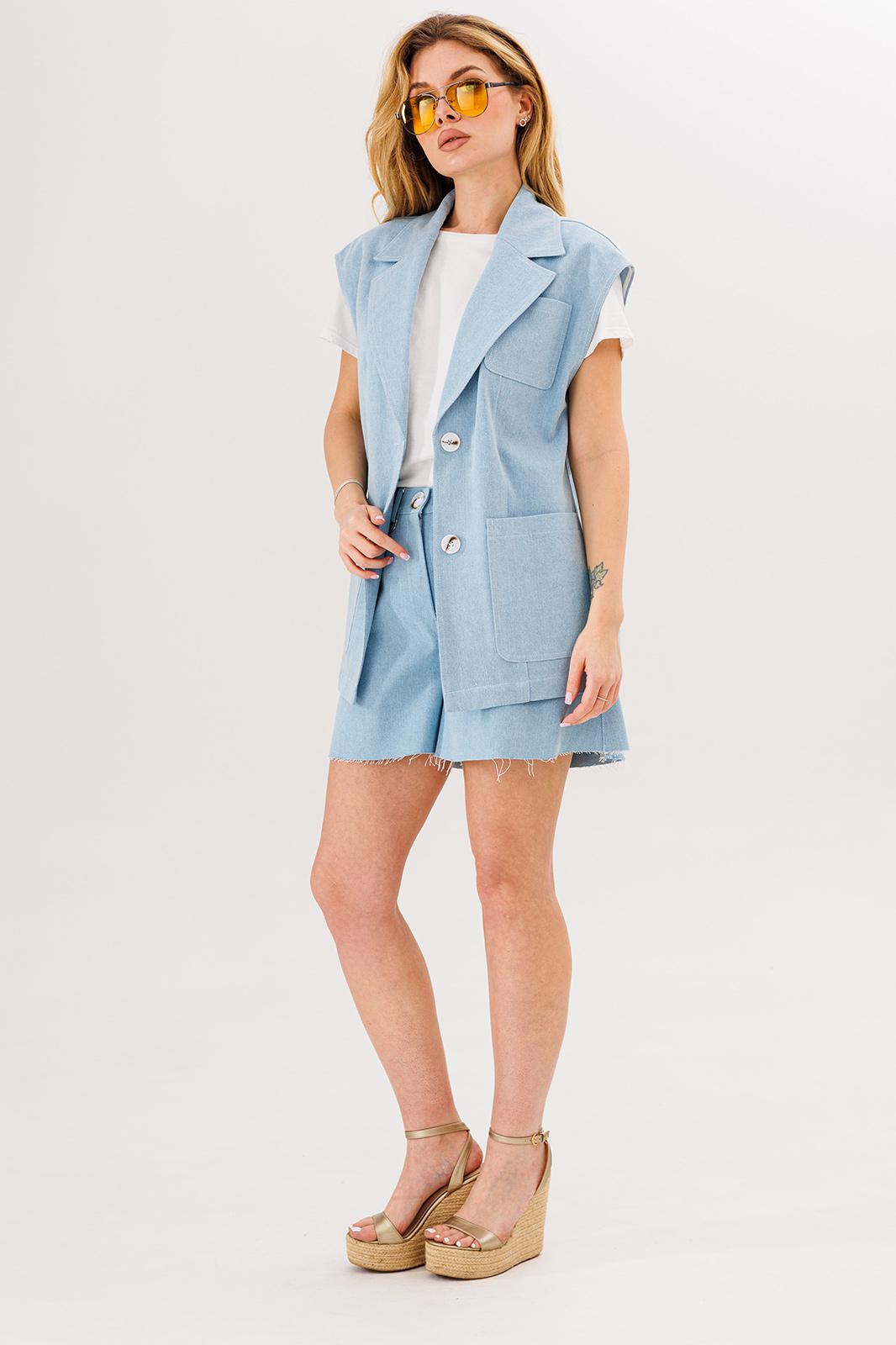 Комплект состоит из жилета и шорт. Выполнены из джинса. Жилет - с накладными карманами, съемным поясом.
