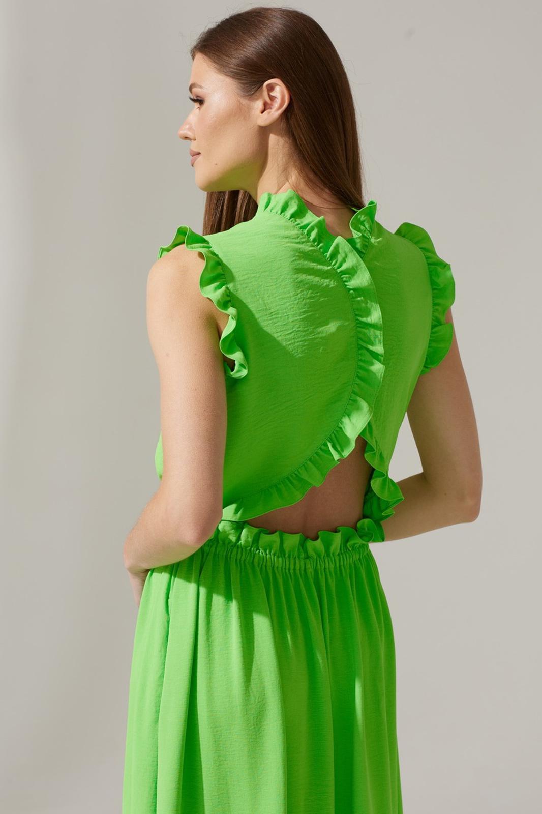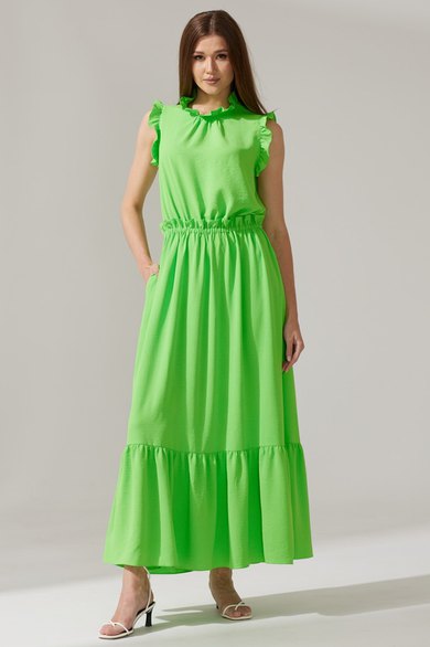 Дополнительное описание: платье с карманами в боковых швах.Проймы платья, горловина полочки и спинки обработаны декоративной рюшей. Спинка с фигурным вырезом и рюшей. Юбка платья на резинке, по низу с рюшей.