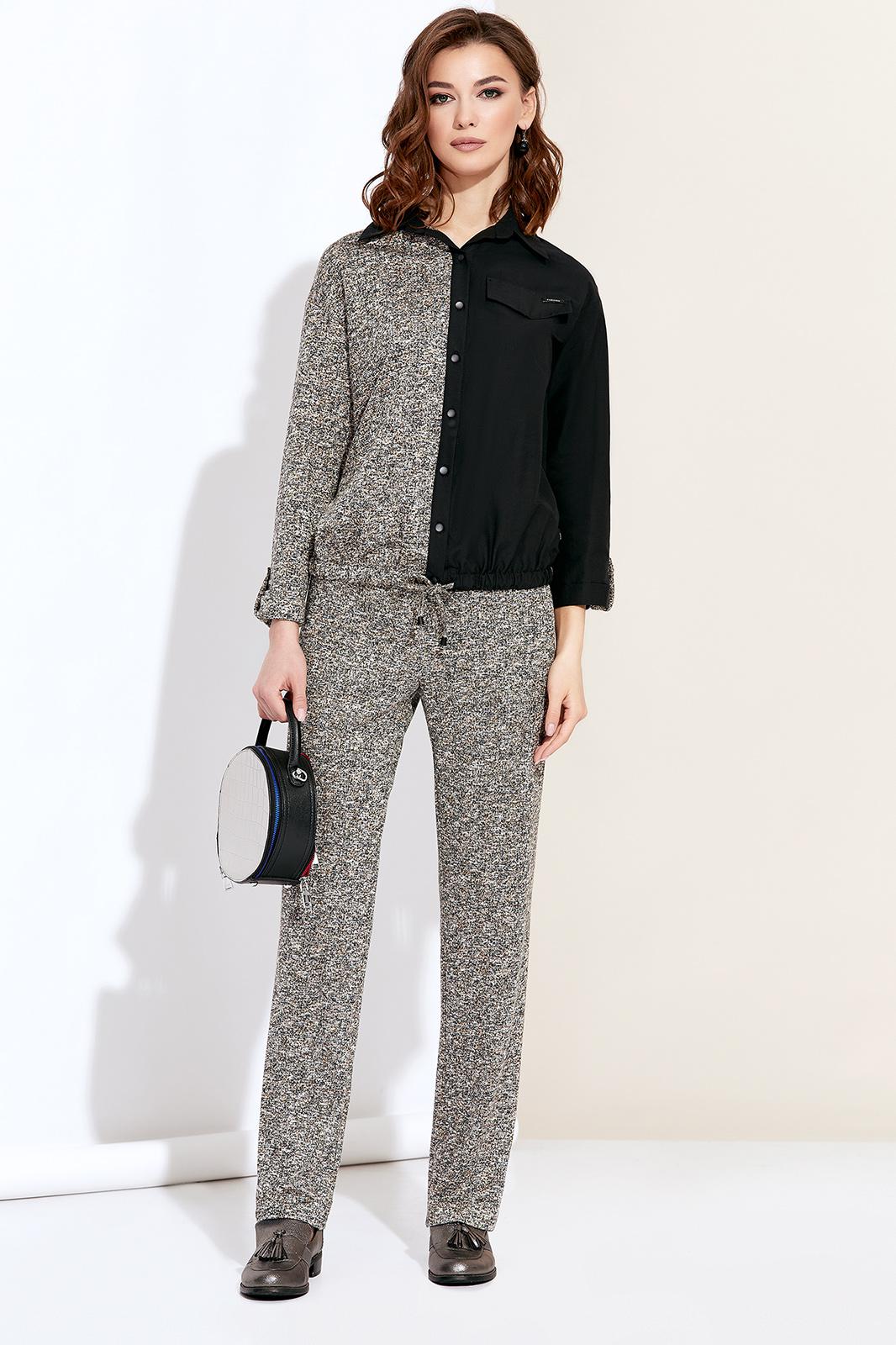 Стильный брючный комплект, состоит из джемпера и брюк. Джемпер полуприлегающего силуэта, выполнен высококачественной костюмной ткани с добавлением вискозы и черного хлопка. По переду джемпер с планкой и застежкой на пуговицы, низ на резинке, с завязкой на тесьму из основной ткани. Рукава с манжетой и застежкой на пату и пуговицу. Брюки прямые, слегка зауженные к низу, на поясе, выполнены из высококачественной костюмной ткани с добавлением вискозы с застёжкой на пуговицу и молнию. Комплект удобный и практичный, отлично подойдет для ежедневной носки.
