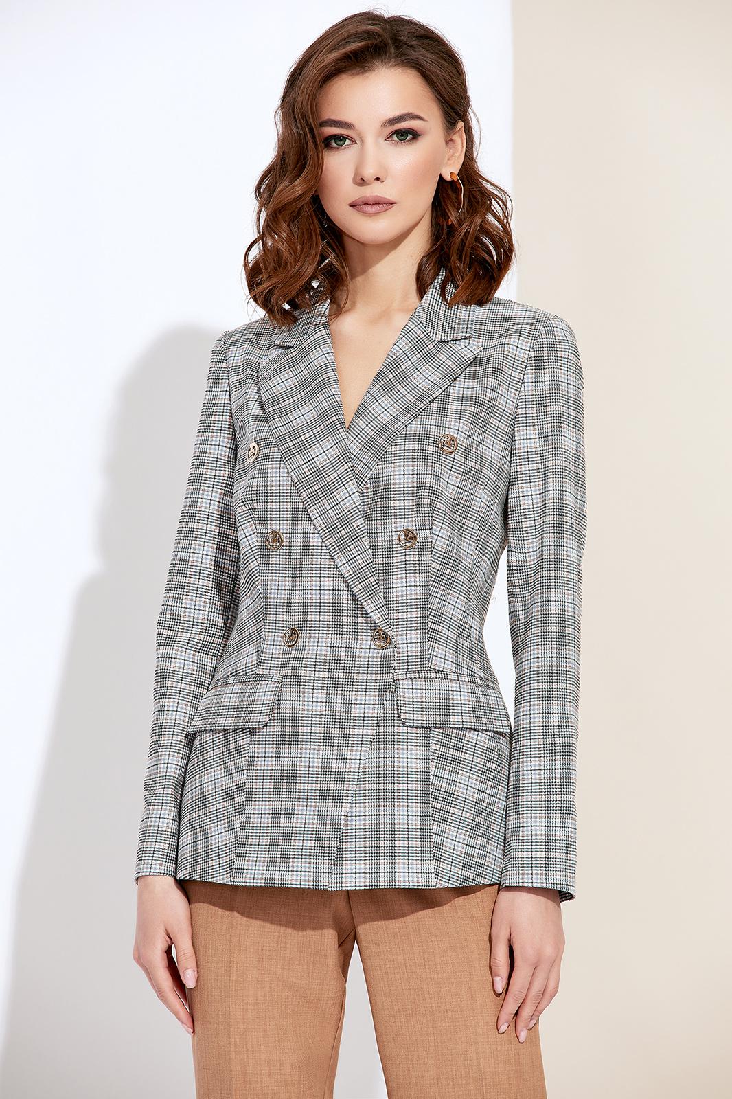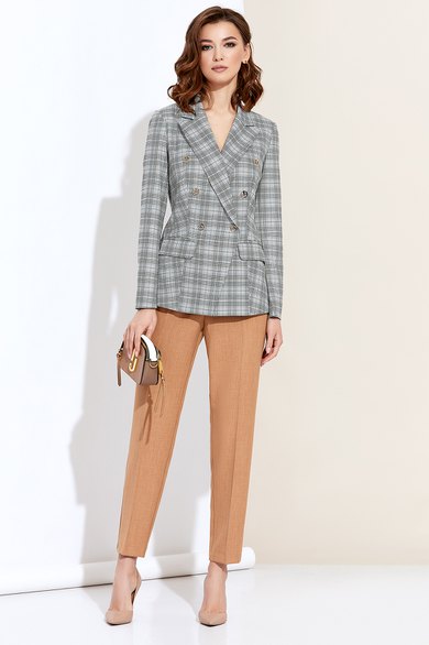 Современный женский костюм, состоит из жакета и брюк. Жакет полуприлегающего силуэта, выполнен из высококачественной костюмной ткани в клетку, с добавлением вискозы. Жакет двубортный, с застежкой по переду на пуговицы. Рукава втачные. Брюки прямые, слегка заужены к низу, выполнены из высококачественной костюмной ткани в клетку, с добавлением вискозы, на поясе, по переду с застежкой на пуговицу и молнию. В боковых швах брюк функциональные карманы. Модель костюма стильная и практичная, отлично подойдет для ежедневной носки и торжественного мероприятия.