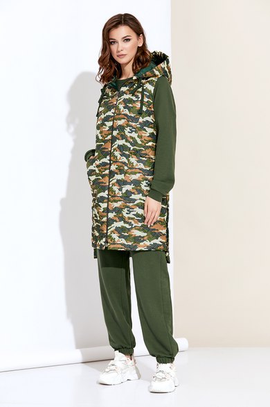 Стильный спортивный комплект, состоит из жилета, джемпера и брюк. Джемпер прямого силуэта, выполнен из высококачественного трикотажа. Перед джемпера декорирован стильной печатью. Брюки прямые, на поясе с резинкой и завязкой на шнур. Низ брюк с манжетой из резинки. Жилет удлиненный, выполнен из высококачественной стеганой ткани, по переду с застежкой на металлическую молнию и накладными функциональными карманами. Жилет с капюшоном, и завязкой на шнур. Модель стильная и практичная, прекрасно подойдет для ежедневной носки.