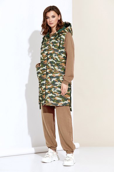 Стильный спортивный комплект, состоит из жилета, джемпера и брюк. Джемпер прямого силуэта, выполнен из высококачественного трикотажа. Перед джемпера декорирован стильной печатью. Брюки прямые, на поясе с резинкой и завязкой на шнур. Низ брюк с манжетой из резинки. Жилет удлиненный, выполнен из высококачественной стеганой ткани, по переду с застежкой на металлическую молнию и накладными функциональными карманами. Жилет с капюшоном, и завязкой на шнур. Модель стильная и практичная, прекрасно подойдет для ежедневной носки.