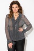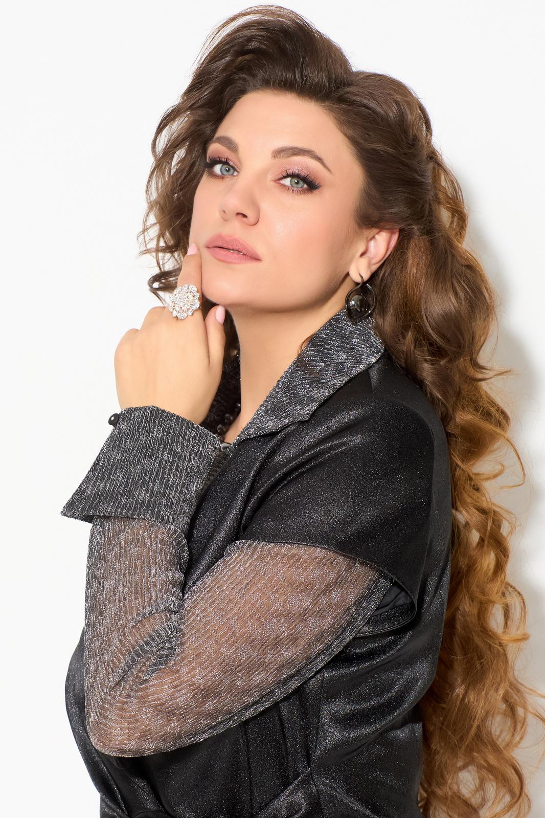 Блузка Аста нарядная, прилегающего силуэта, выполнена из жатой сетки. По горловине полочки рюша. В рюшу вставлен шнур. Застежка однобортная на навесные петли и пуговицы. Воротник отложной, на стойке, рубашечного типа. Рукав втачной, по низу рукава отложной манжет с застежкой на навесные петли и пуговицы.