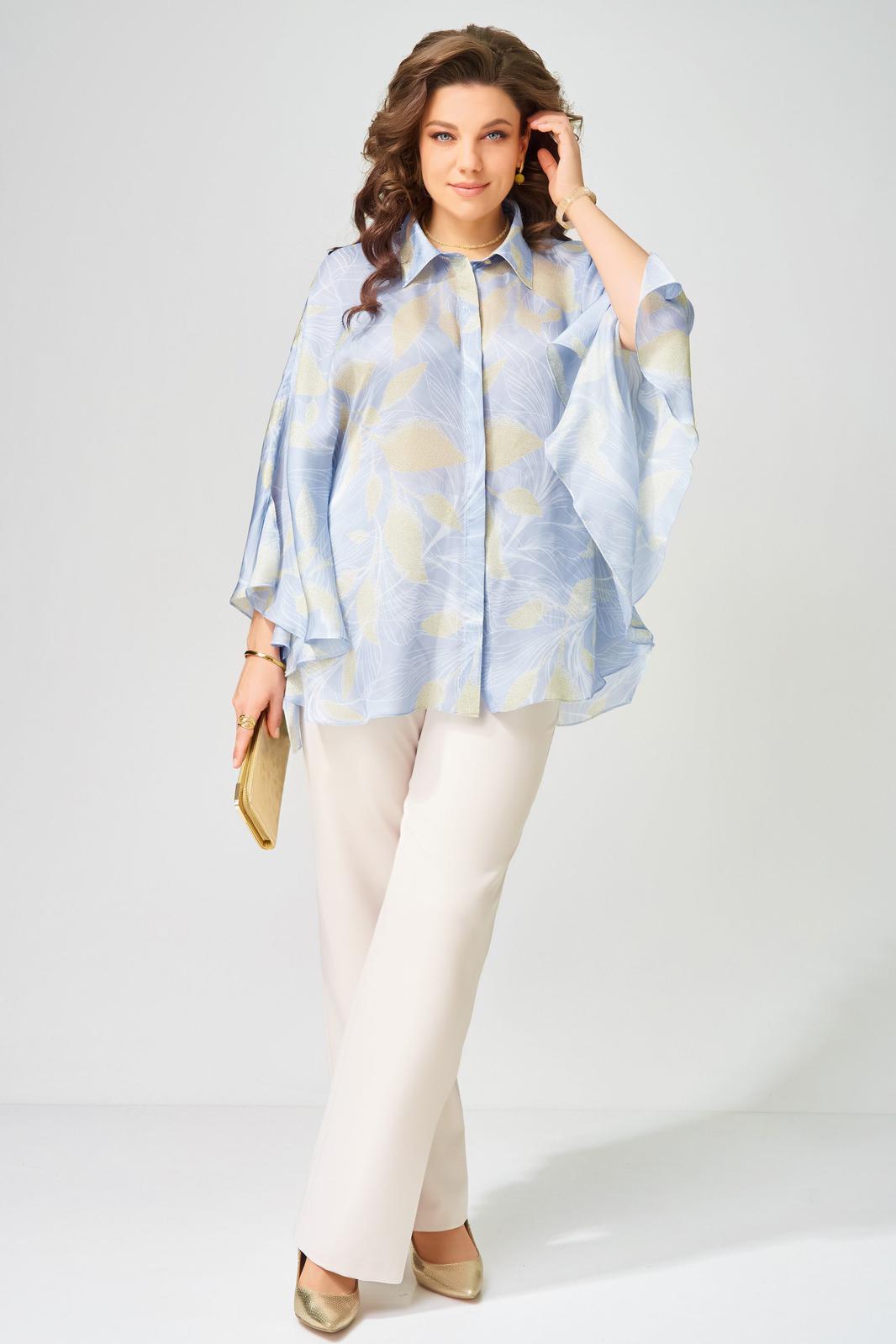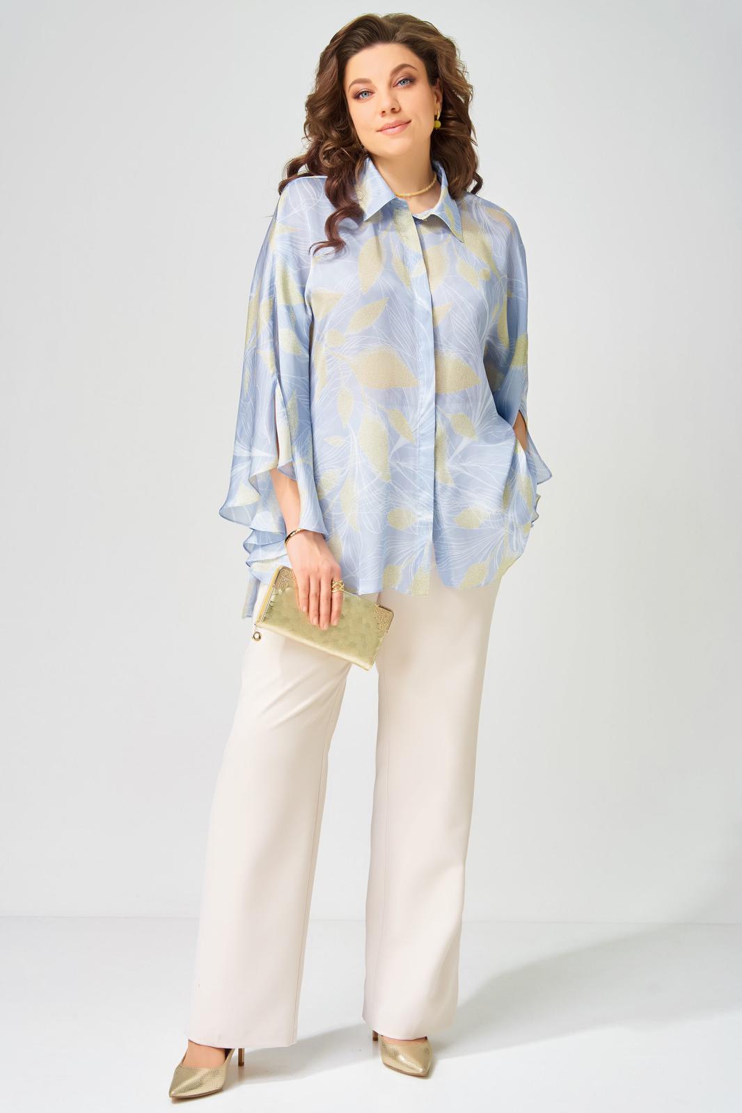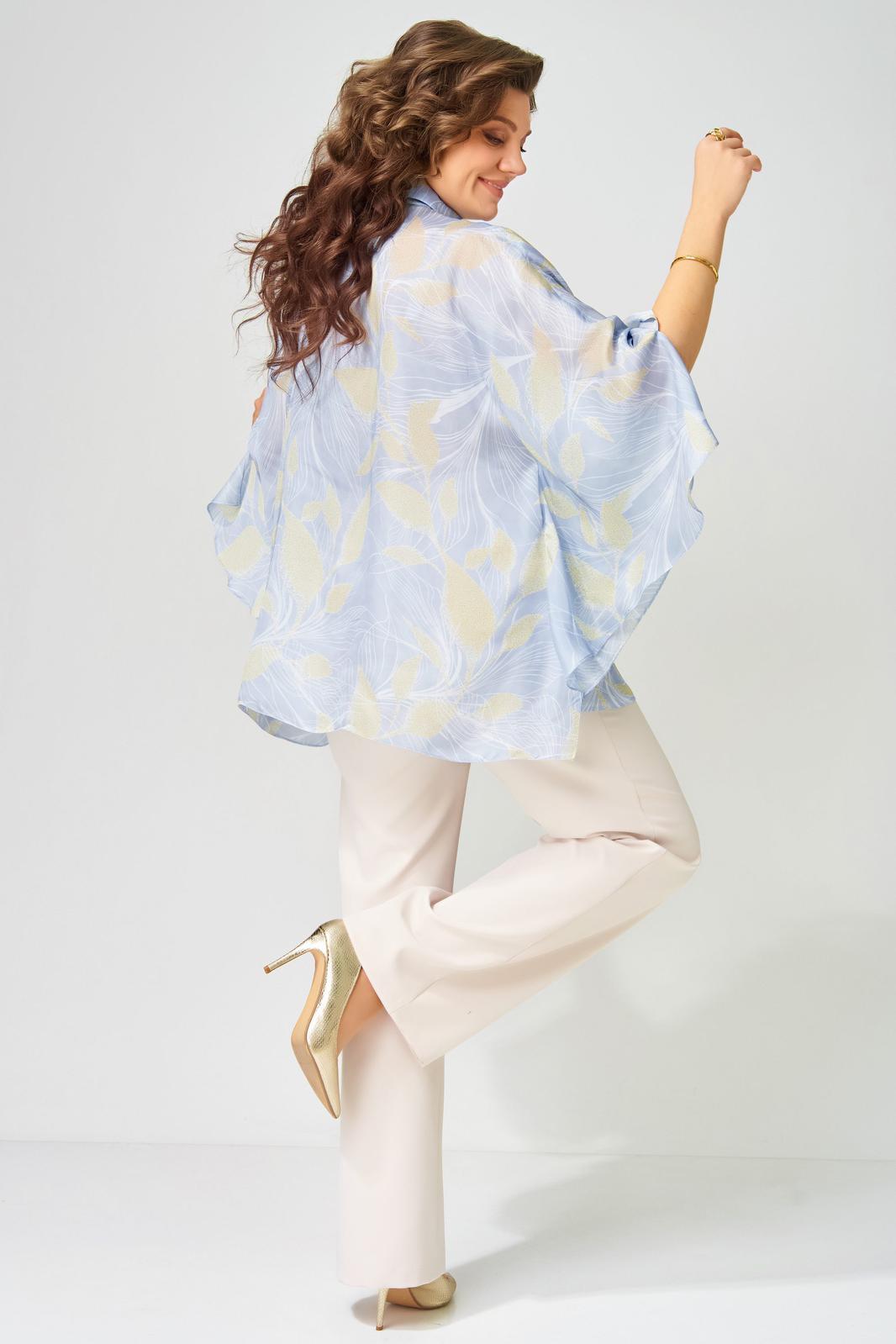 Женский комплект аля-Пугачева двойка Ветрана состоит из блузки-разлетайки и брюк. Блузка расширенная к низу. Полочка на потайную застежку на петли и пуговицы. Воротник рубашечного типа на стойке. Низ обработан швом в подгибку. Брюки прямого силуэта с застежкой на молнию и пуговицу. По переду брюк карманы, верх брюк обработан поясом, по спинке резинка. Низ брюк обработан в подгибку. Этот наряд прекрасно подойдет для любого праздника на на выход в город.