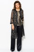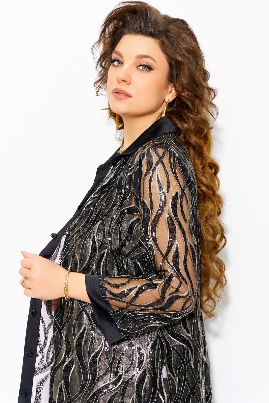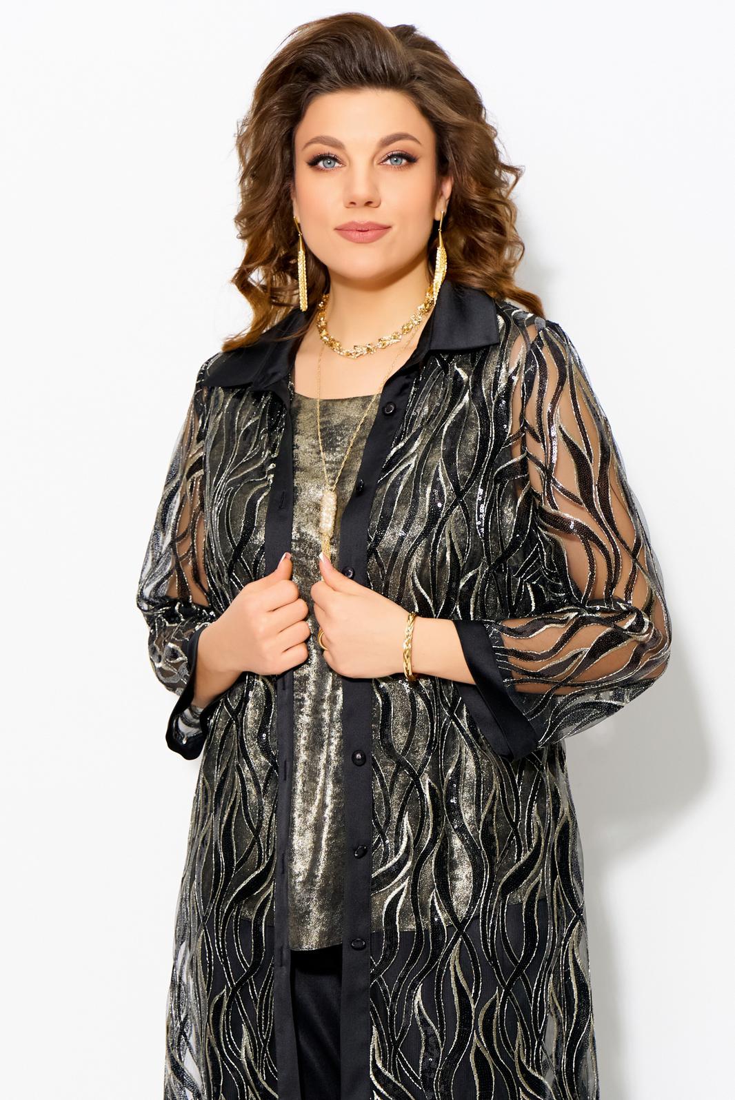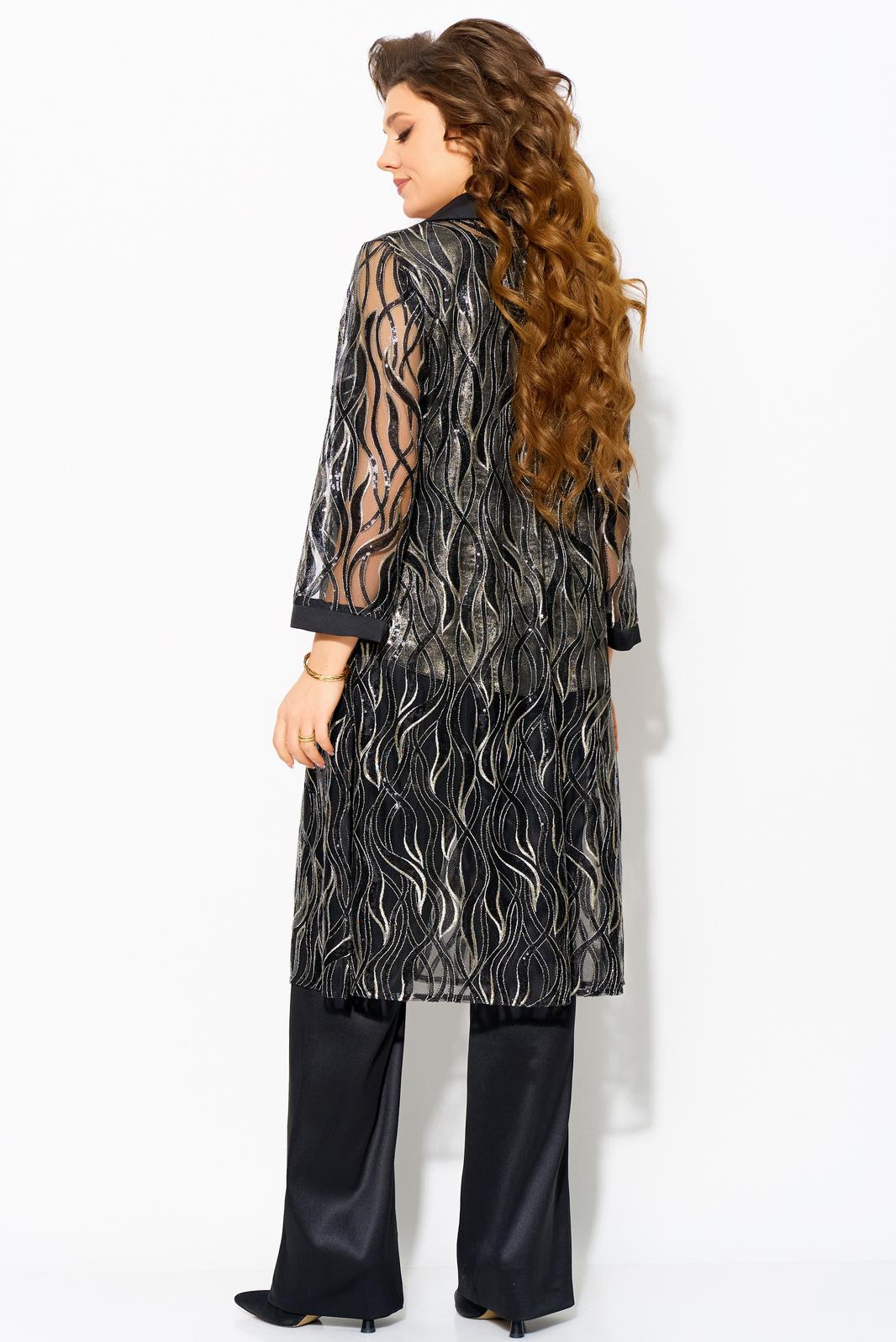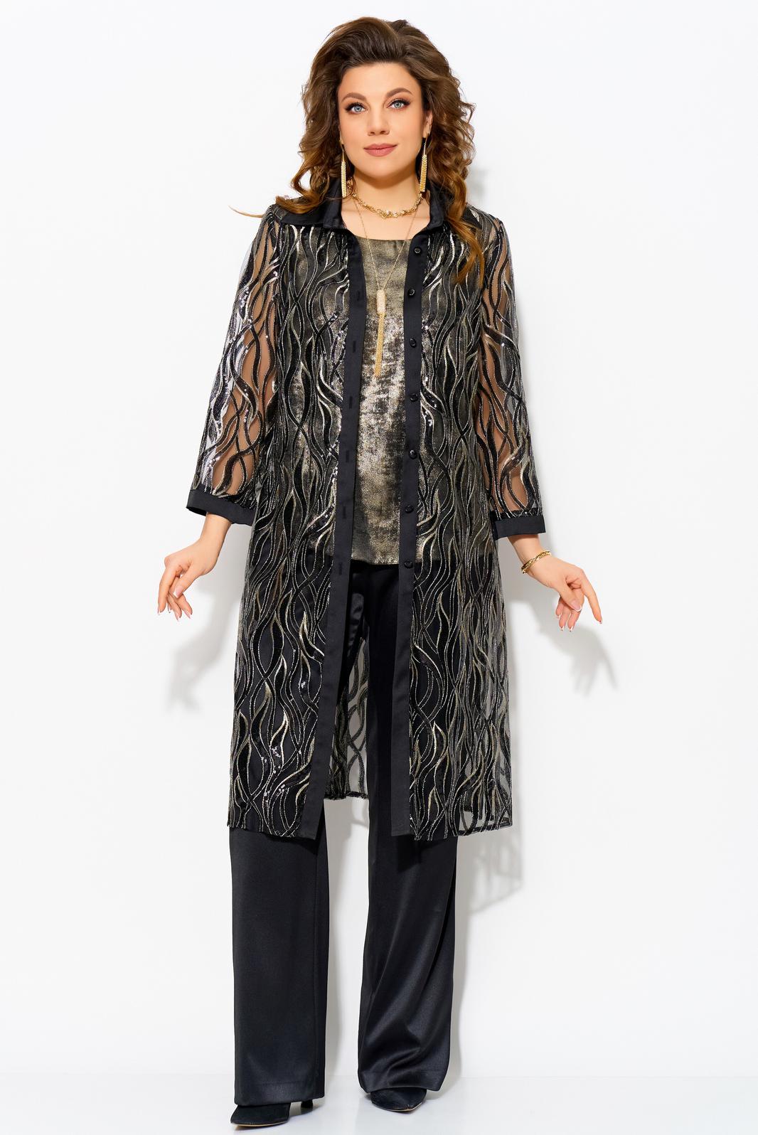 Комплект тройка Димия. Состоит из кардигана, брюк и майки-топ. Кардиган нарядный Димия прямого силуэта, с застежкой на петли и пуговицы. Край борта обработан планкой. Воротник отложной со стойкой рубашечного типа. Рукав одношовный, втачной. Низ рукава обработан атласной планкой. По боковым швам разрезы. Низ изделия обработан швом в подгибку закрытым срезом. Брюки выполнены из атласной ткани прямого силуэта с застежкой на молнию и пуговицу. По переду брюк карманы, верх брюк обработан поясом, по спинке резинка. Низ брюк обработан в подгибку. Топ выполнен из сатиновой ткани. Прямого силуэта, по полочке нагрудная вытачка, проймы и горловина обработаны обтачкой.