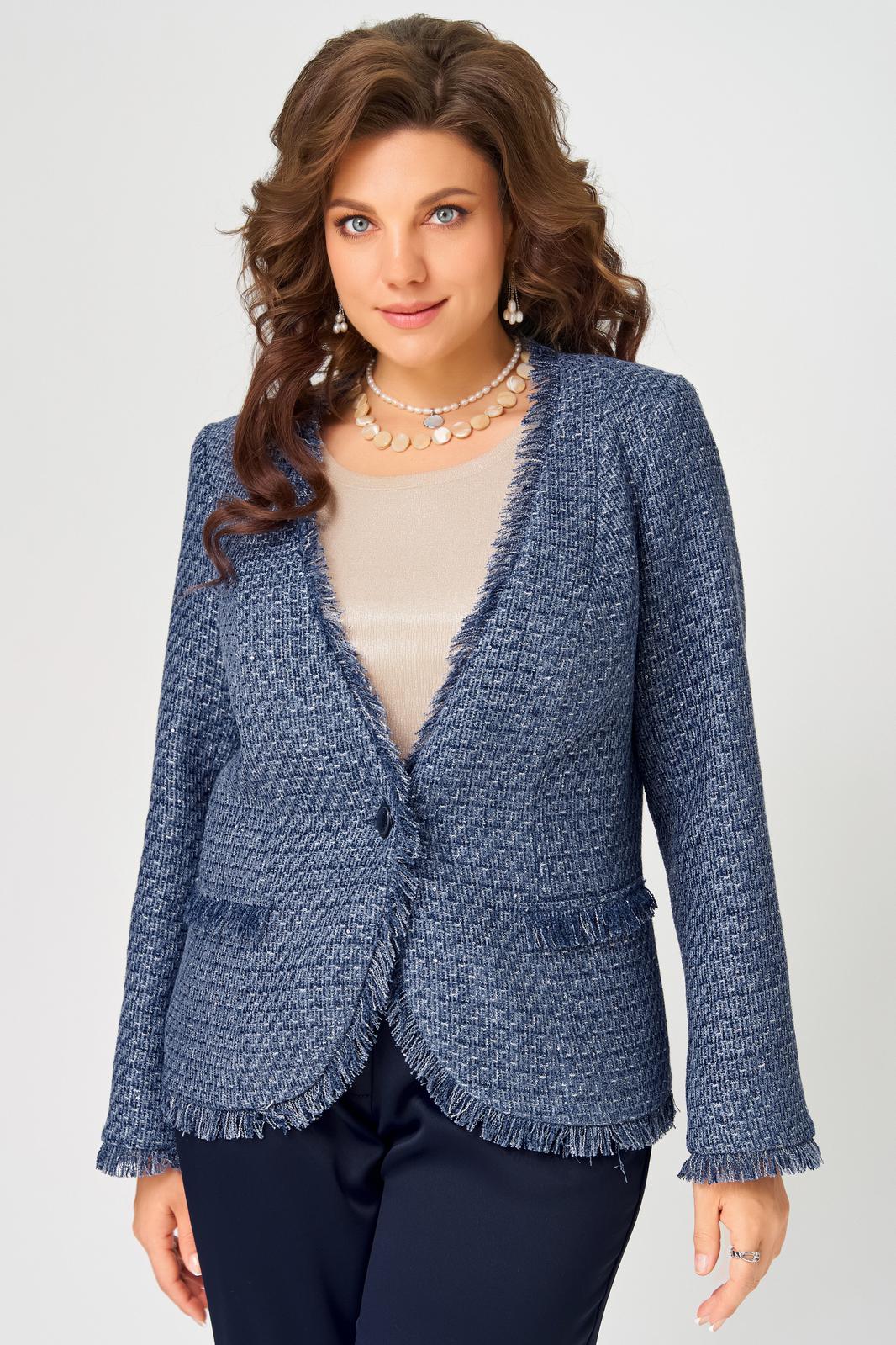 Жакет выполнен из твидовой ткани на подкладке полуприлегающего силуэта. Застежка в жакете однобортная на пуговицу, по полочке - рельефы, карман-обманка в виде настроченной трепки, по спинке рельефы. По краю борта и низа жакета вставлена трепка, рукав втачной двухшовный, по низу рукава вставлена трепка.
