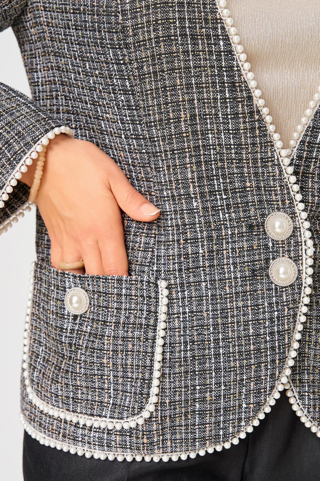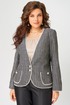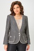 Жакет на подкладке полуприлегающего силуэта. Застежка в жакете однобортная на две пуговицы. По полочке рельефы, два накладных кармана, обрамленных декоративной тесьмой с застежкой на петлю и пуговицу. По спинке рельефы. По краю борта в жакете, по низу изделия и по низу рукавов настрочена декоративная тесьма.