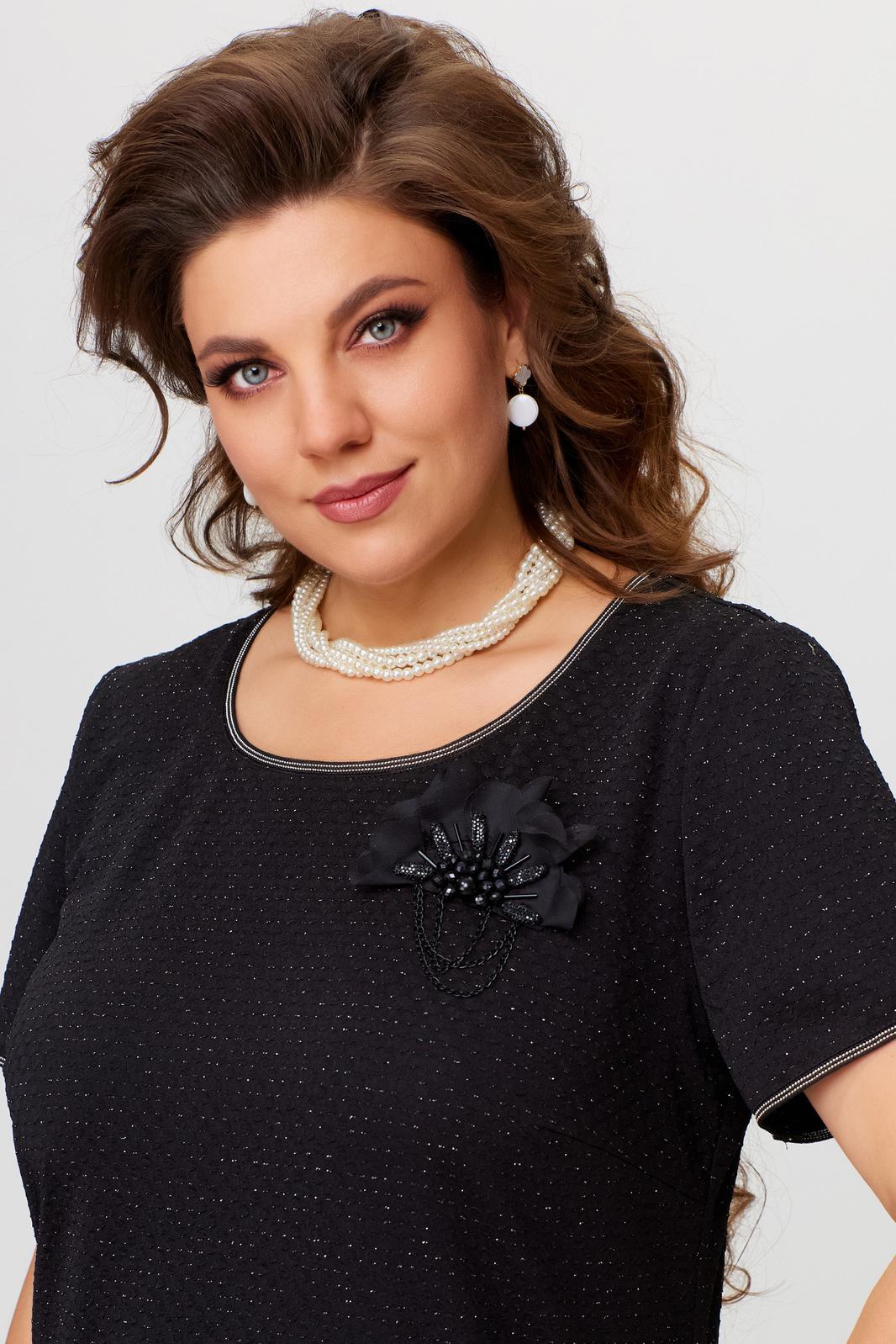 Трикотажное платье выполнено из нарядного трикотажного полотна в горошки с тонкой золотистой люрексовой ниточкой. Платье полуприлегающего силуэта, по полочке нагрудная выточка, в среднем шве спинки - потайная молния, по низу - шлица, горловина обтачена подкладной, в шок вставлена декоративная тесьма, рукав одношовный втачной, по низу рукава притачена декоративная тесьма.