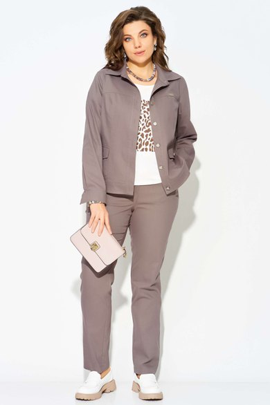 Джемпер — это голос комплекта, его эмоциональный центр. Прилегающий силуэт мягко очерчивает фигуру, а вытачка по груди — как легкий штрих скульптора. Горловина, обработанная планкой, завершает образ сдержанно и элегантно. Но главное — печать «Леопард» на полочке. Это не просто принт, это вызов, энергия, дикая грация, которая прячется под спокойной поверхностью.