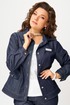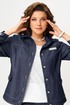 Бомбер полуприлегающего силуэта выполнен из хлопковой джинсовой ткани без подкладки. Застежка в бомбере однобортная на петли и пуговицы, планка по борту отрезная, отсроченная отделочными строчками. По полочке - кокетка и рельефы. Карманы накладные с клапаном и с застежкой на петли и пуговицы. По спинке - кокетка и рельефы. Рукава в бомбере втачные двухшовные, по низу рукава - манжет с застежкой на петли и пуговицы. Воротник отложной рубашечного типа со стойкой, по низу бомбера отрезной пояс, отсроченный отделочной строчкой. На кокетке полочки, с левой стороны декоративная нашивка.