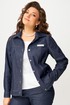 Бомбер — словно дыхание урбанистического ритма, выполнен из хлопковой джинсовой ткани, легкой и уверенной. Его полуприлегающий силуэт обнимает фигуру, не сковывая движений, а однобортная застежка на петли и пуговицы — как акцент в музыкальной партитуре. Кокетки и рельефы на полочке и спинке придают объем и архитектурность, будто фасады старинных зданий, переосмысленные в современном ключе. Накладные карманы с клапанами — функциональные и стильные, а манжеты на рукавах и отложной воротник со стойкой добавляют нотку винтажной строгости. Декоративная нашивка на кокетке — как подпись художника на холсте.
