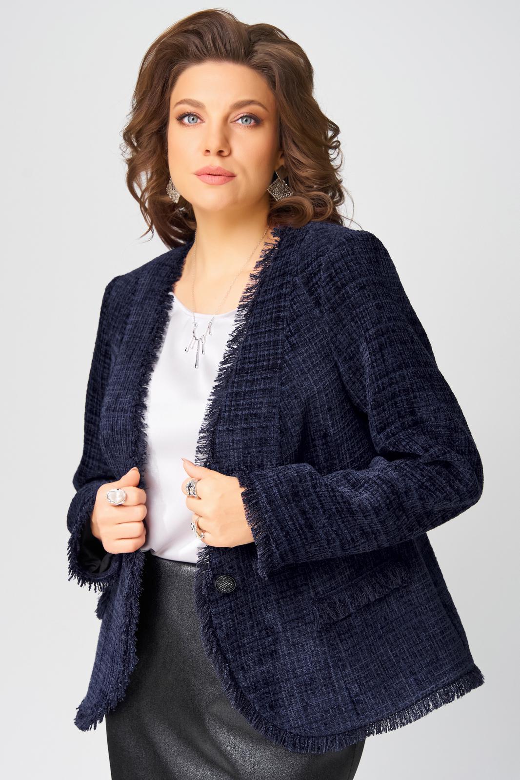Жакет выполнен из твидовой ткани на подкладке полуприлегающего силуэта. Застежка в жакете однобортная на пуговицу, по полочке - рельефы, карман-обманка в виде настроченной трепки, по спинке рельефы. По краю борта и низа жакета вставлена трепка, рукав втачной двухшовный, по низу рукава вставлена трепка.