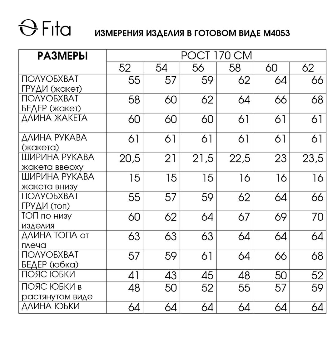 - Тип ткани: жакет: 60% вискоза, 36% полиамид , 4% спандекс; юбка: 70% полиэстер, 30% вискоза; блузка: 95% искусственный шелк, 5% спандекс.
