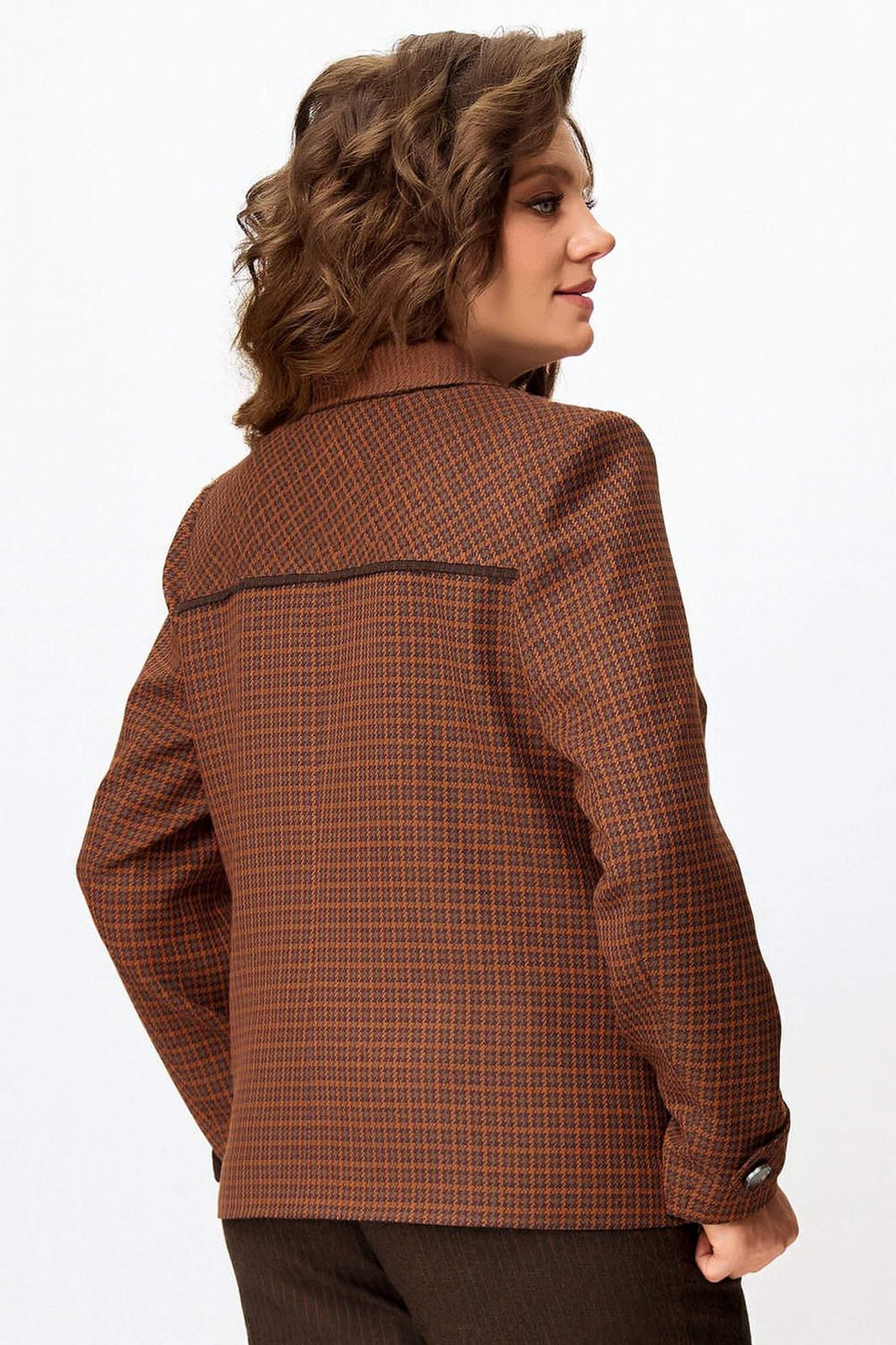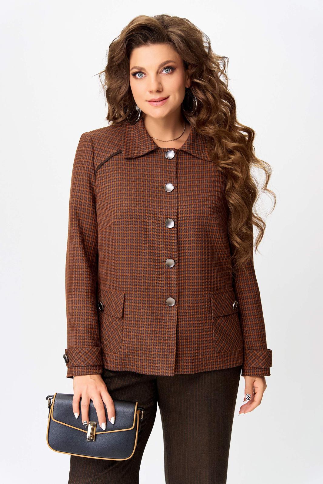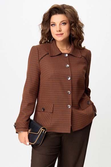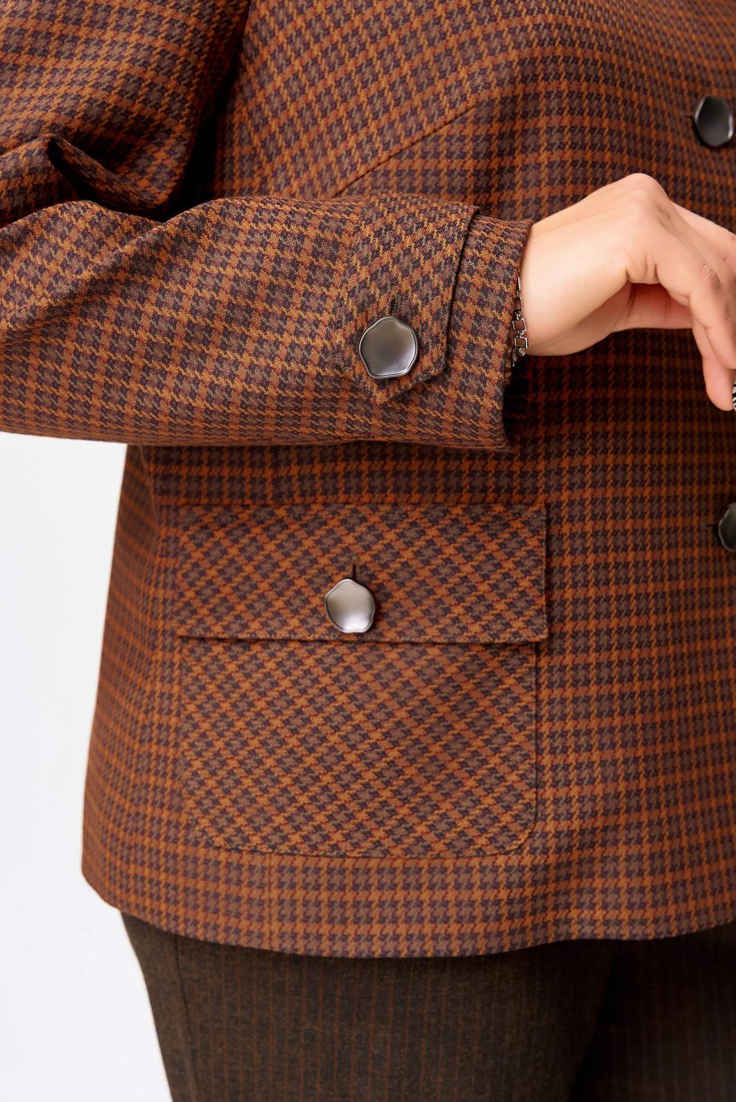 Женский стильный жакет Венциана из клетчатого текстиля, полностью на подкладке, с элегантным полуприлегающим силуэтом. Его дизайн отличает однобортная застежка на пуговицы и классический отложной воротник. Передняя часть изделия искусно оформлена нагрудными вытачками и отрезными бочками, а верхняя часть полочки украшена кокеткой с вшитым декоративным кантом. Функциональные накладные карманы с клапанами также застегиваются на пуговицы. Спинка имеет средний шов и отрезную кокетку сверху, также с декоративным кантом. Двухшовные втачные рукава завершаются декоративными патами на пуговицах.
