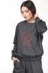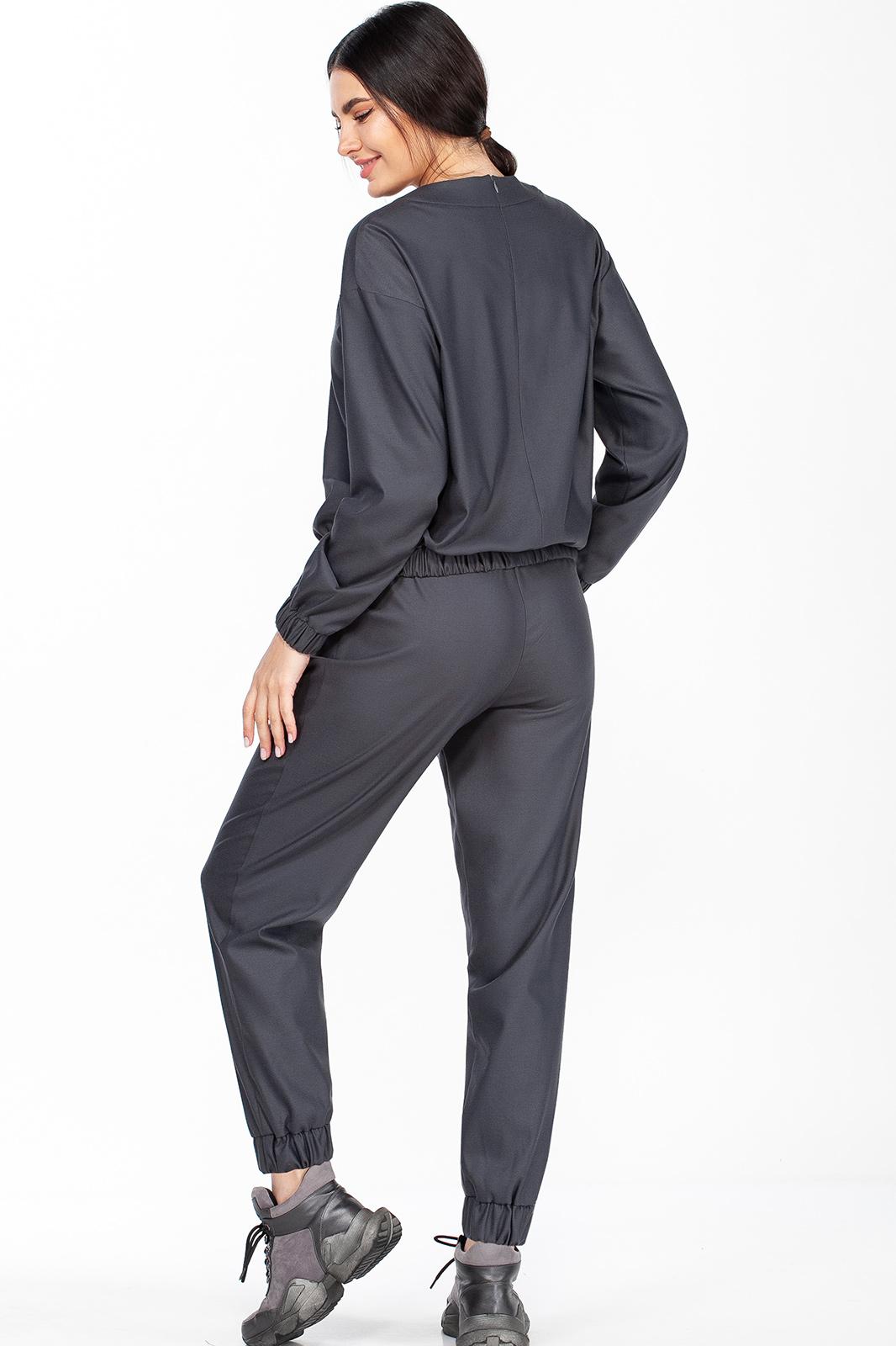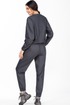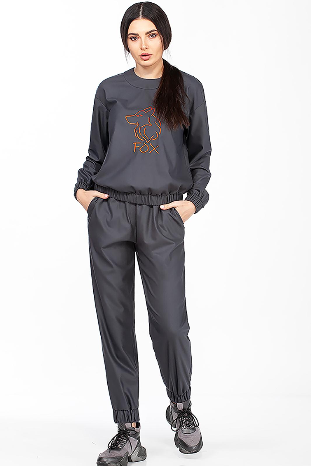 Костюм, состоящий из джемпера и брюк, выполненный из мягкой костюмной ткани. Джемпер свободного силуэта со втачными рукавами на манжетах, по низу планка с эластичной тесьмой, по спинке потайная молния для удобства растегивания, по переду фирменная декоративная вышивка. Брюки свободного силуэта с манжетами по низу, в боковых швах карманы, в пояс и манжеты вставлена эластичная тесьма.
