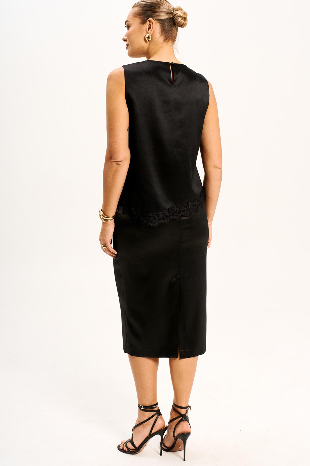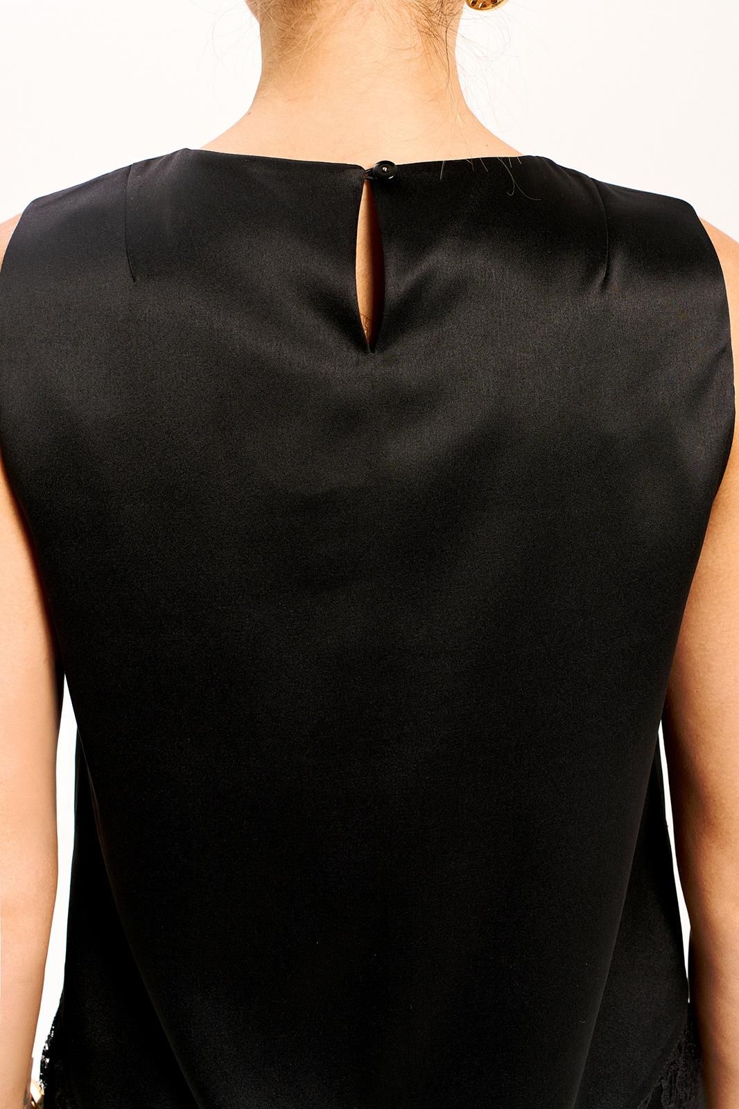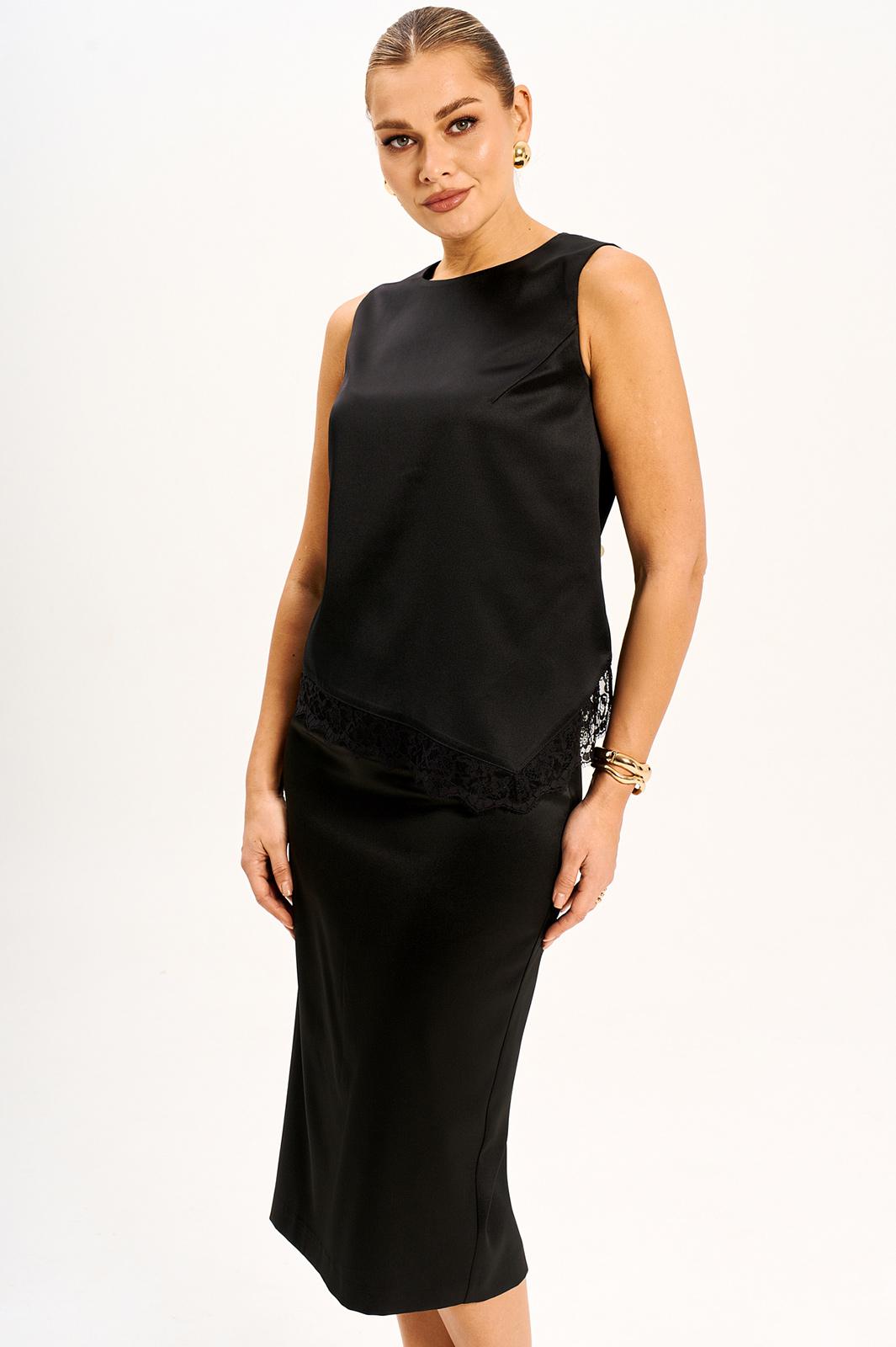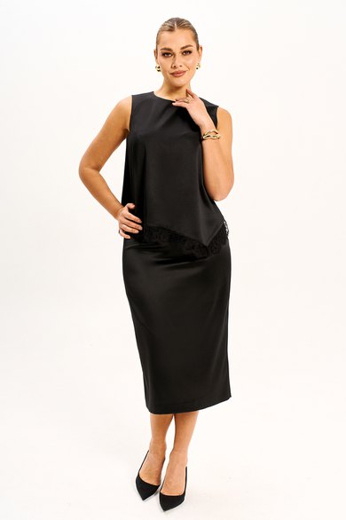 Женский костюм полуприлегающего силуэта выполнен из шелк- сатина средней плотности. Блуза с ассиметричной линией низа дополнена французским кружевом, которое держит форму; в боковых швах разрезы; по спинке застежка в виде капельки с петлей и пуговицей. Юбка с завышенной линией талии на подкладке; застежка на молнию; по спинке шлица.