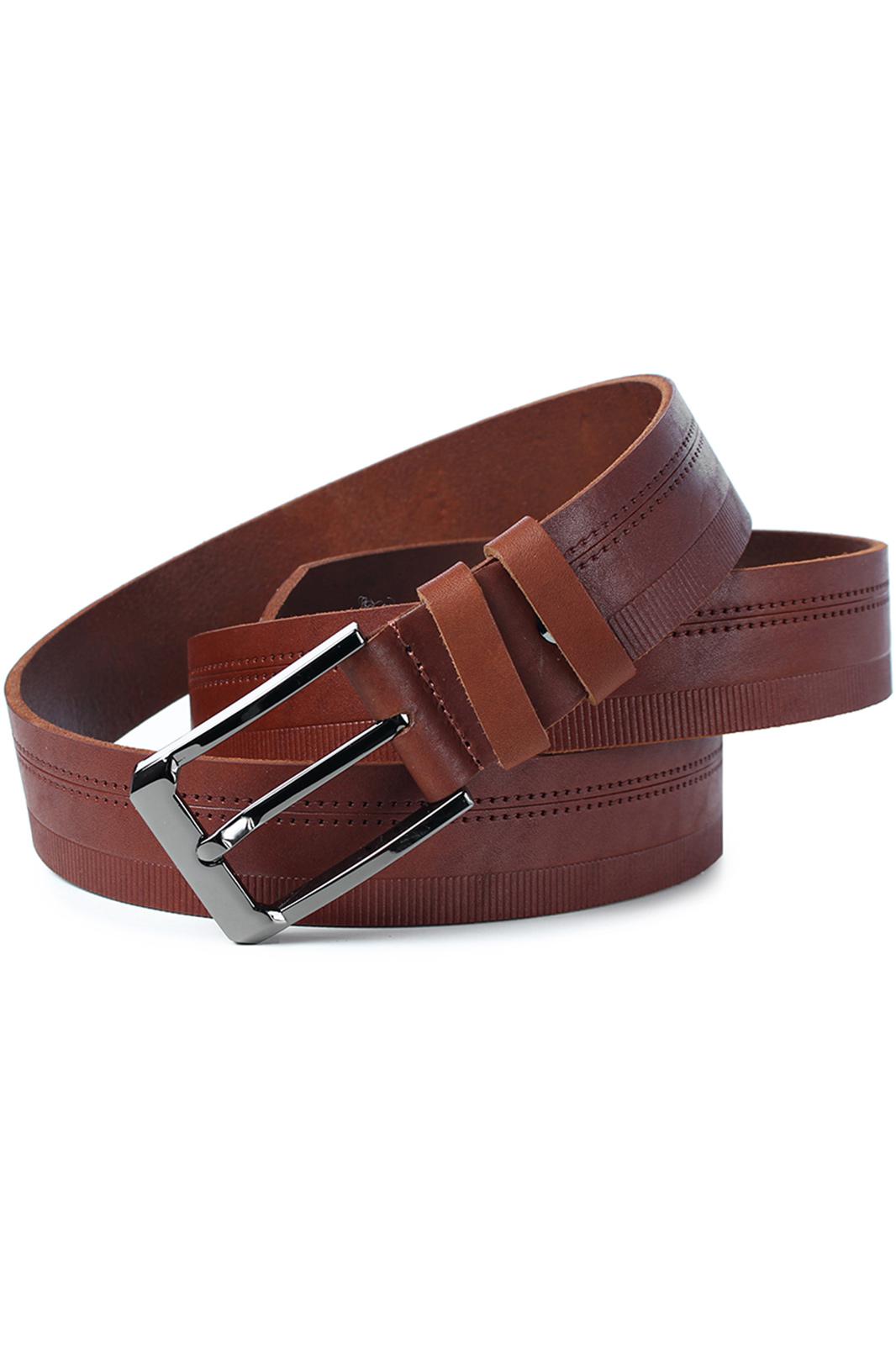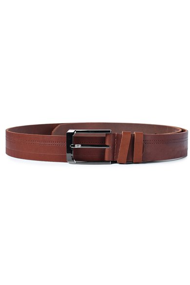 Ремень в обрезку, с обработкой изнанки, с декоративным тиснением ремня, с пряжкой и шлевкой на запряжнике, с одной передвижной шлевкой. Цвет фурнитуры-черный никель.