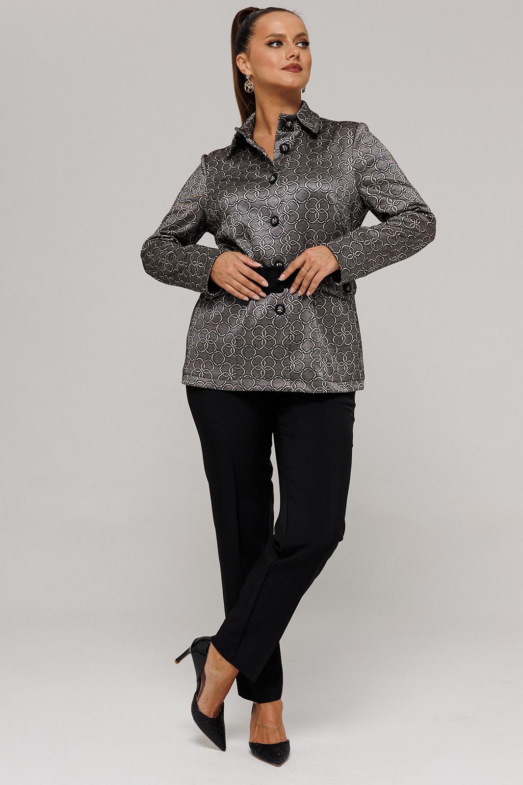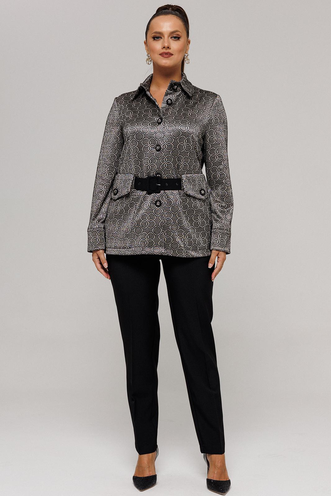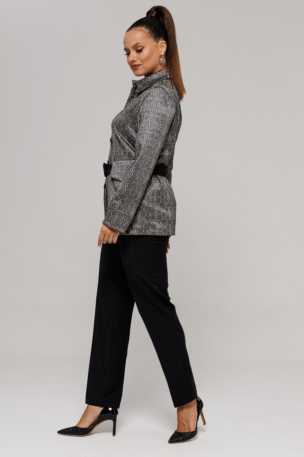 Комплект женский, состоящий из жакета и брюк. Комплект выполнен из двух видов текстильной ткани костюмно-плательной группы. Жакет с рисунком, выполненым текстильным переплетением. Брюки однотонные.