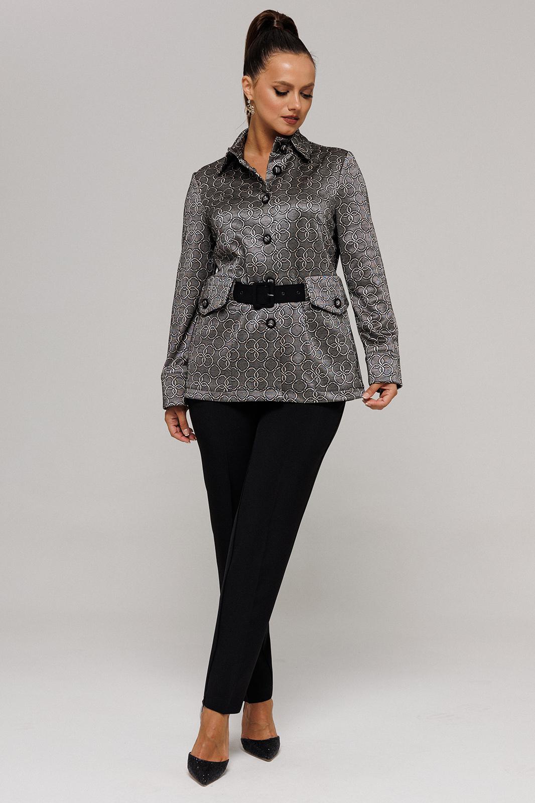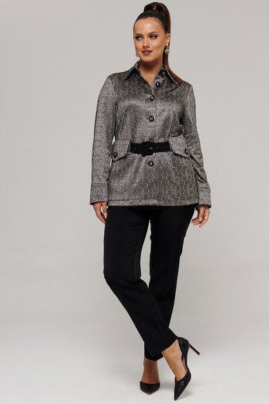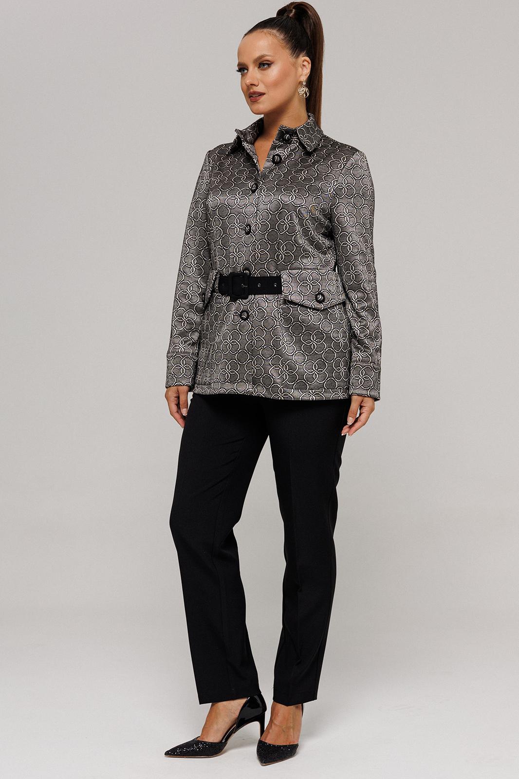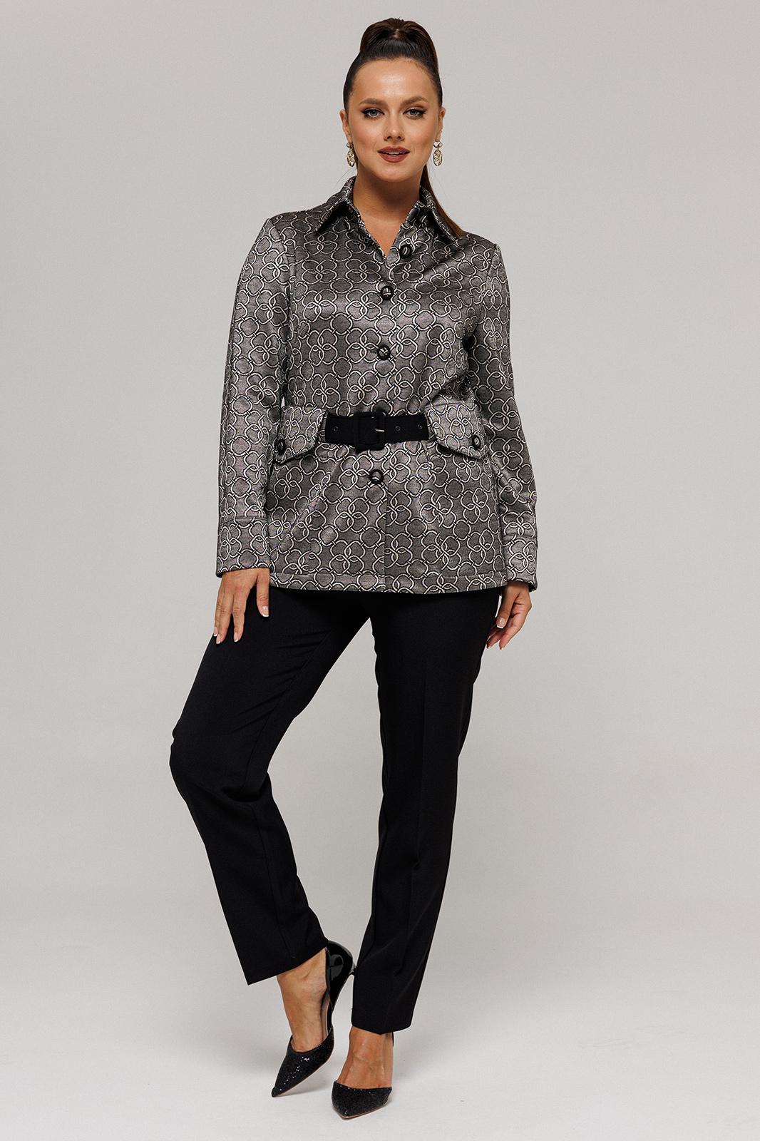 Комплект женский, состоящий из жакета и брюк. Комплект выполнен из двух видов текстильной ткани костюмно-плательной группы. Жакет с рисунком, выполненым текстильным переплетением. Брюки однотонные.