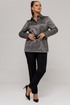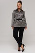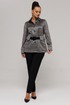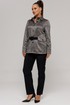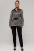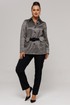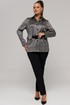 Жакет прямого силуэта, длиной немного ниже линии бедер, рукав длинный, втачной, с широкой бейкой по низу, в которой рисунок ткани расположен по косой. Застежка жакета-до верха, на петли и пуговицы. Воротник со стойкой, отложной. По переду расположены накладные карманы с клапанами. Под клапанами дополнительно имеется частичная кулиска, в которую протягивается ремень, изготовленный из ткани что и боюки. Отделочными строчками дополнены воротник, манжеты, клапаны и карманы жакета.