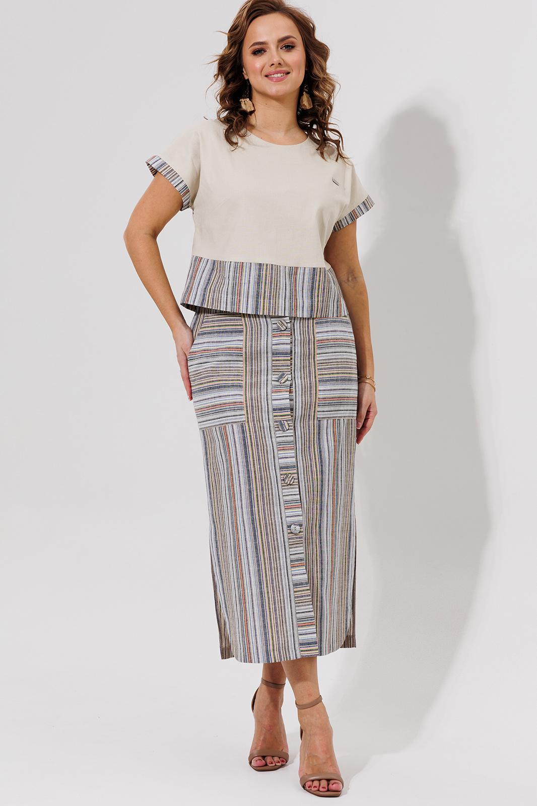 Комплект женский, состоящий из блузки и юбки, из натурального льна. Блузка прямого силуэта с цельнокроенным коротким рукавом, по низу переда и спинки притачная деталь из отделочной ткани, по низу рукава манжеты из отделочной ткани. Перед блузки украшен металлической пришивной фурнитурой. На спинке блузки функциональная застежка-планка с пуговицами из отделочной ткани в полоску.