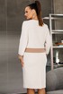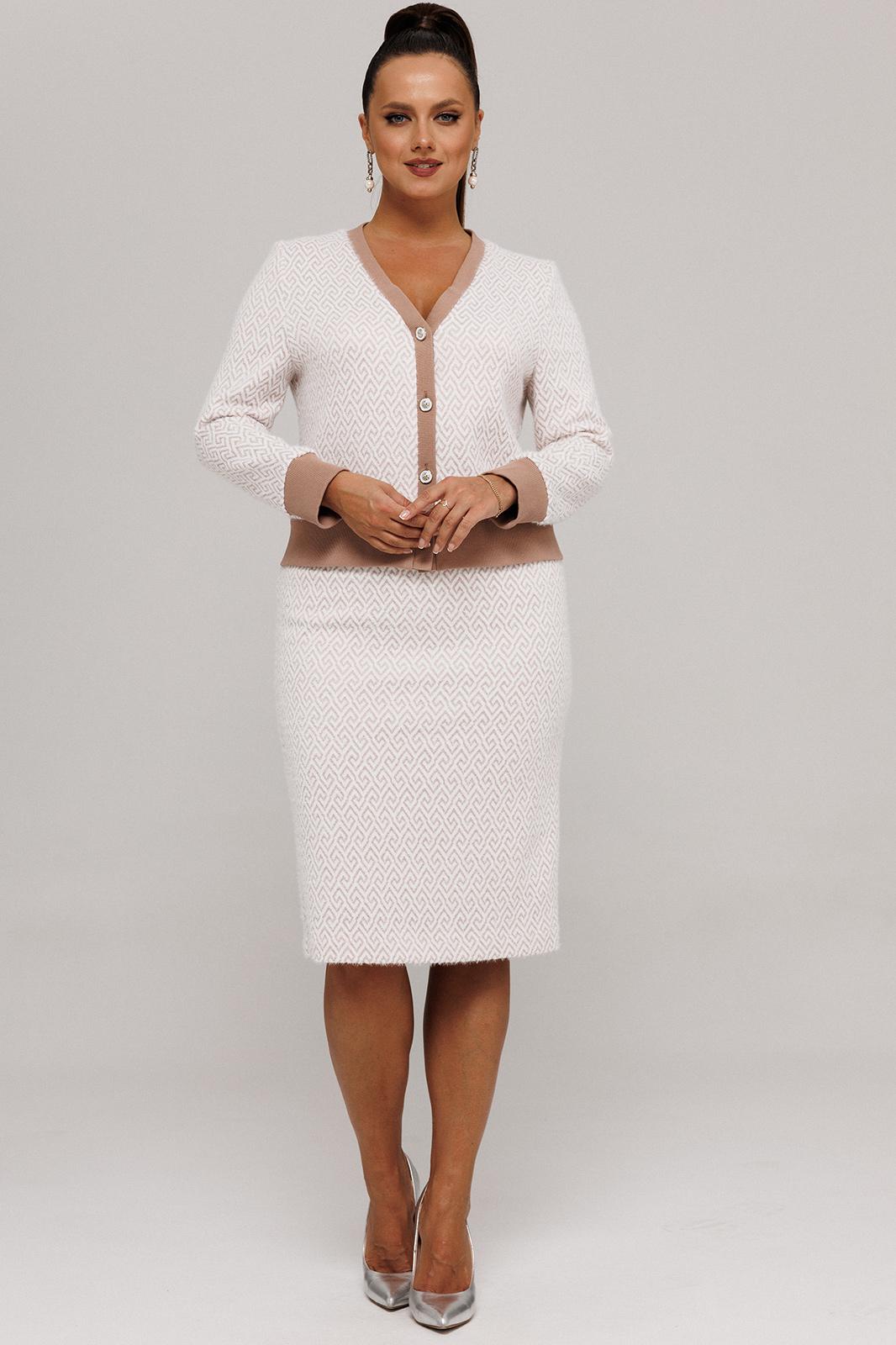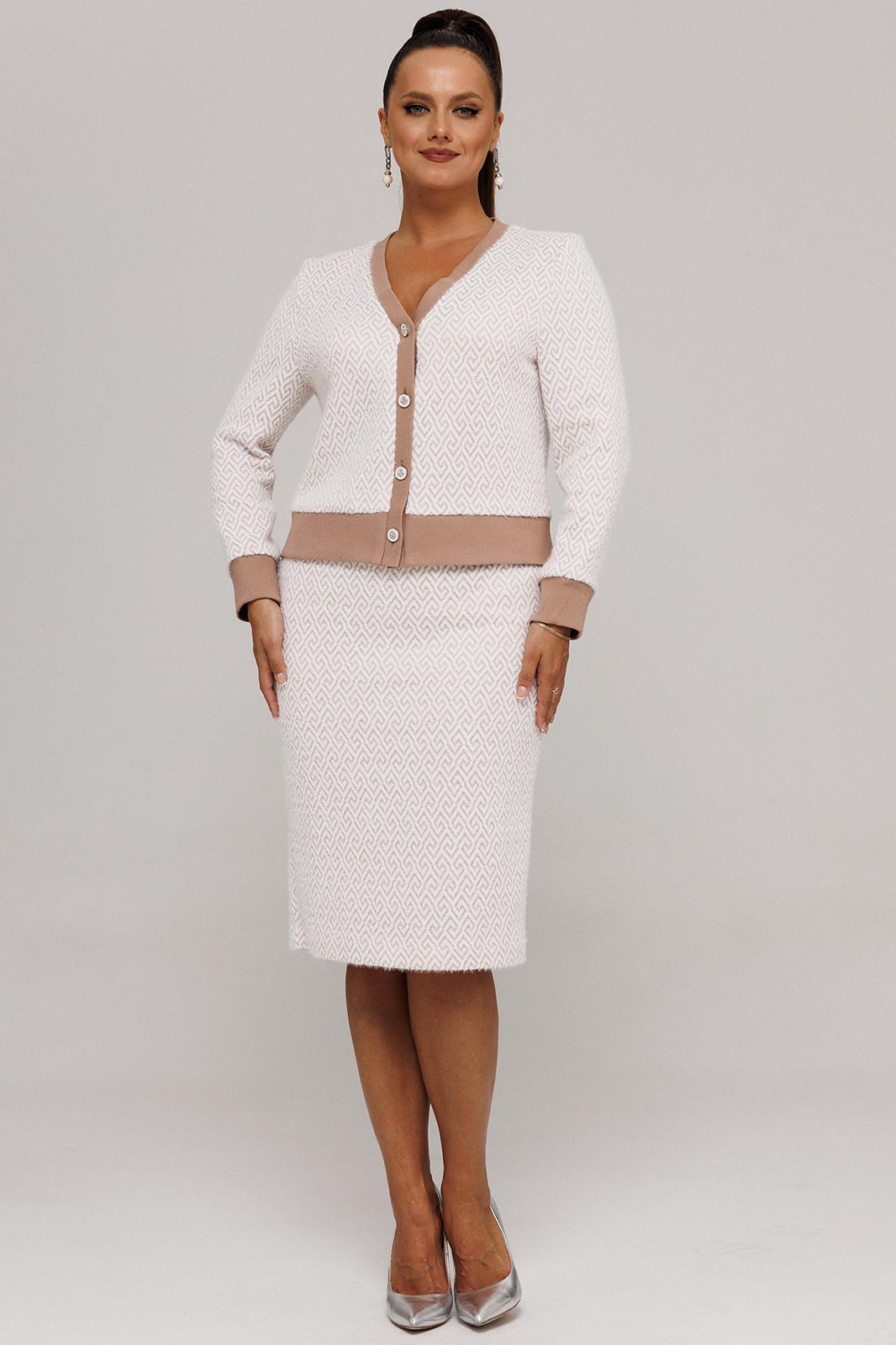 Костюм женский изготовлен из трикотажной ткани.Низ жакета, рукава и край борта обработан довязом. Жакет имеет v-образный вырез. Застёгивается на четыре петли пуговицы.
