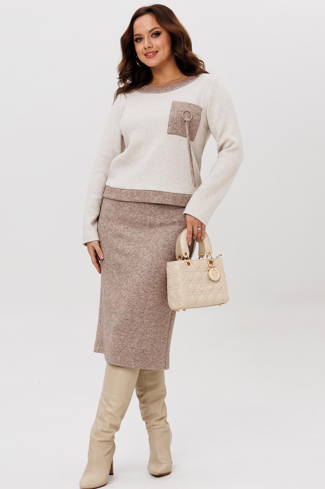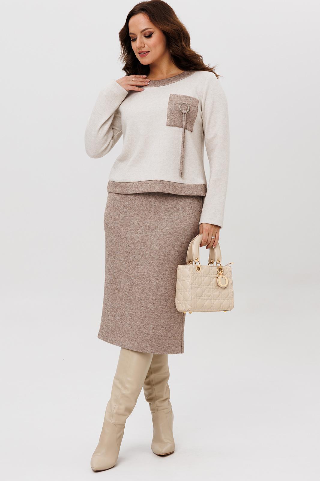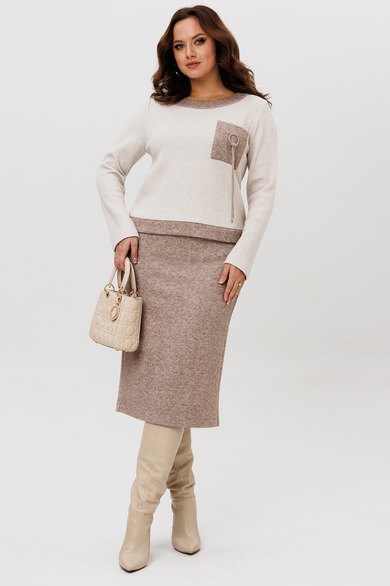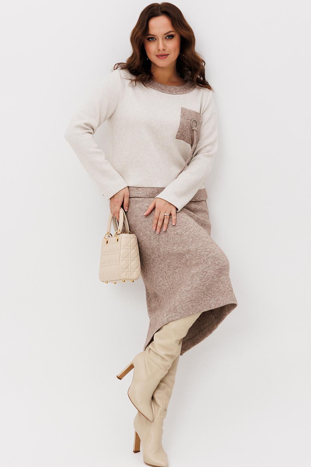 Осенний комплект джемпер и юбка , выполнен из мягкой и приятной к телу трикотажной ткани с добавлением натуральных нитей, которые обеспечивают комфорт и тепло в течение всего дня. Данный юбочный костюм идеально подходит как для офиса, так и для неформального повседневного использования.