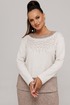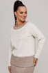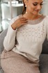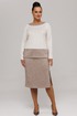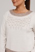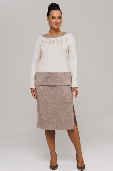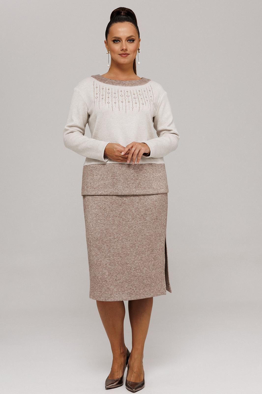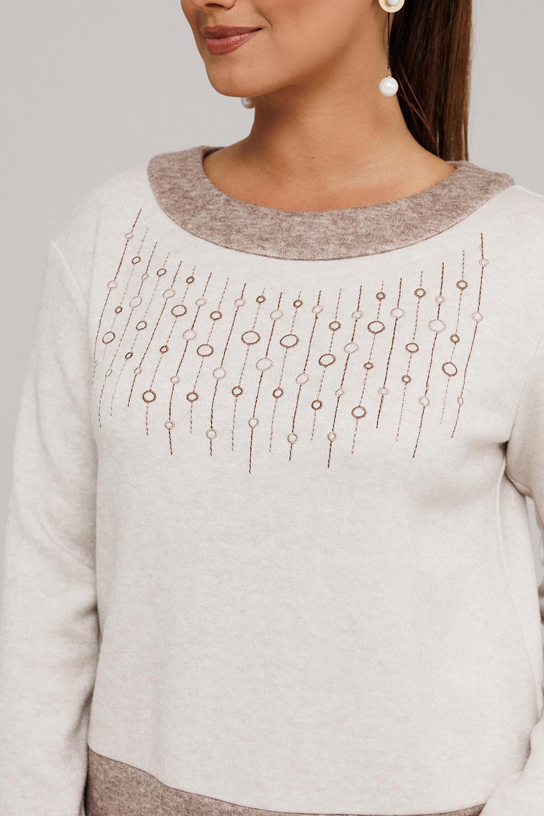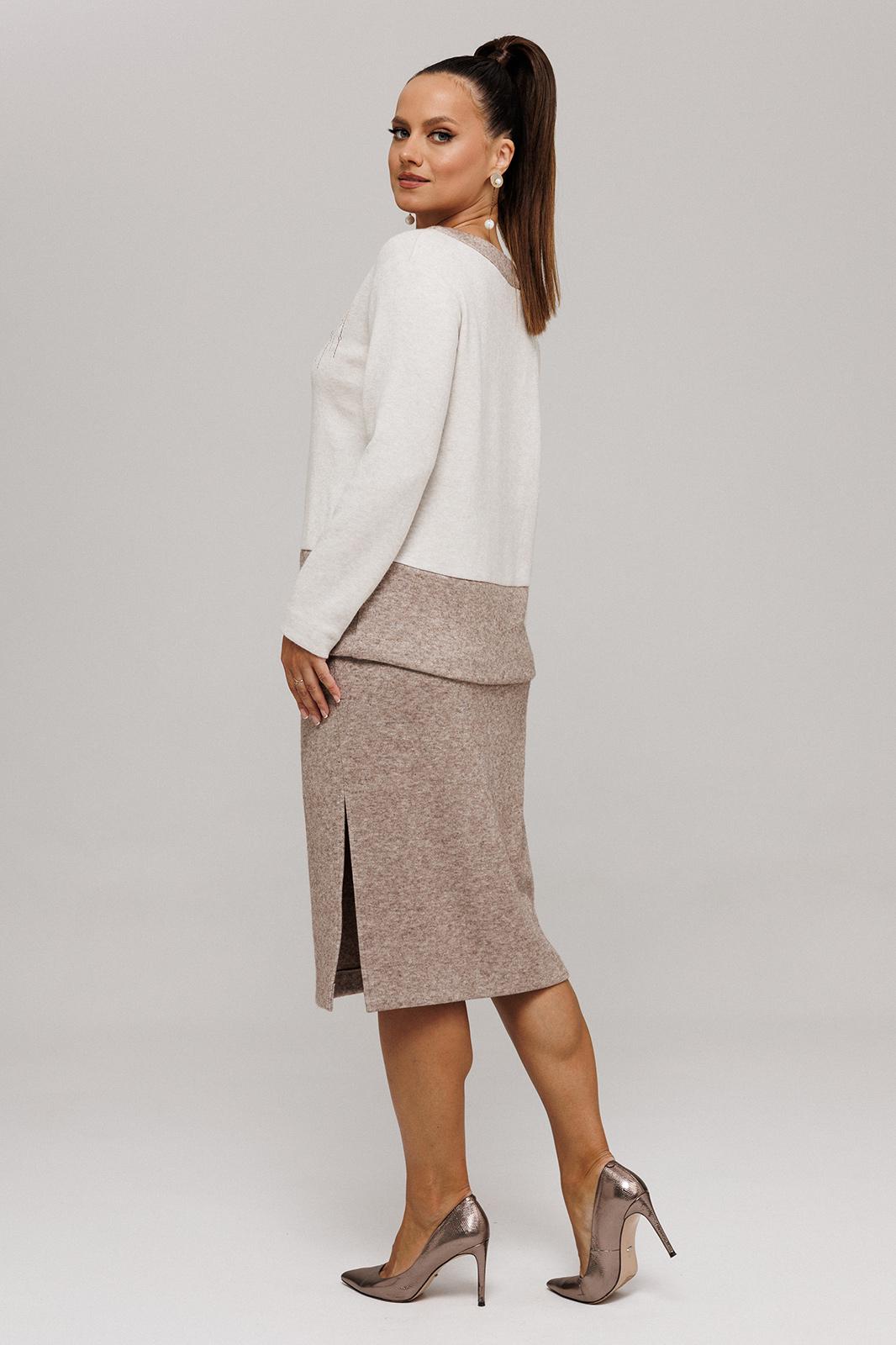 Джемпер данного комплекта прямого силуэта со спущенными рукавом, с планкой по горловине и подрезом ниже линия талии, выполненным из отделочной ткани. Декором данного джемпера служит дизайнерская вышивка