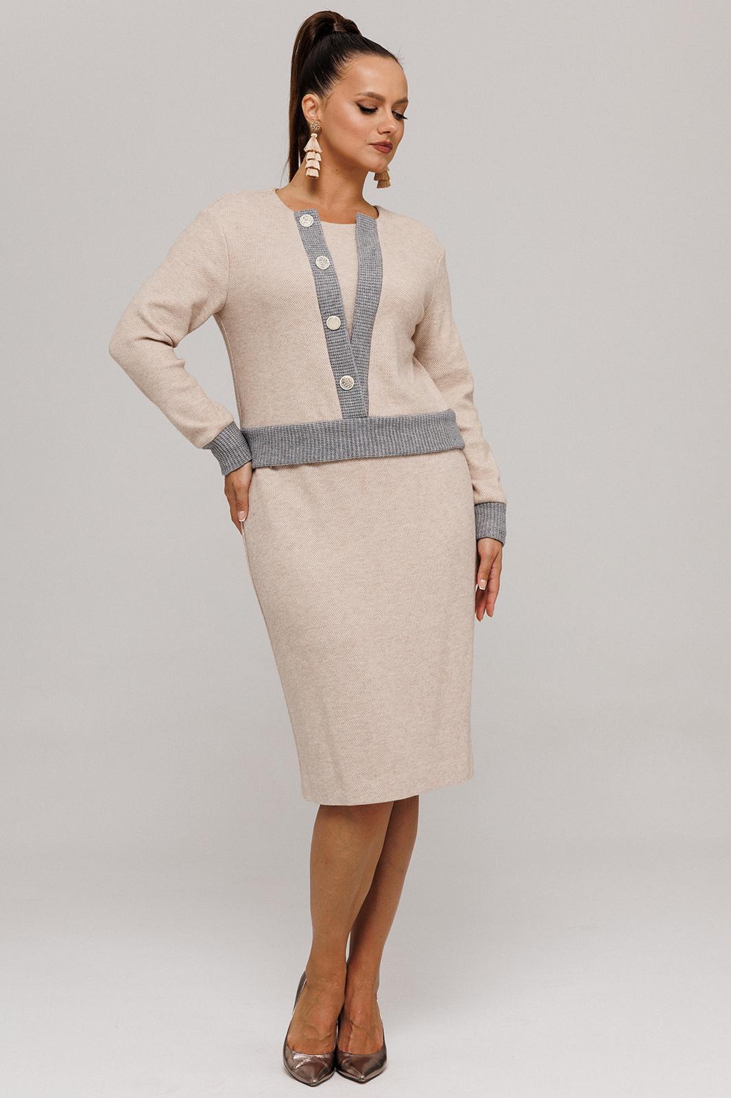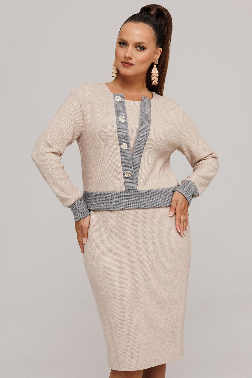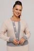 Джемпер прямого силуэта, со спущенным рукавом, по низу рукава и джемпера манжета и планка из вязаного полотна. По переду имеется членение, в которое вставлена планка из вязки, которая создаёт имитацию расстёгнутого джемпера.Декором данного джемпера служат декоративные пуговицы.