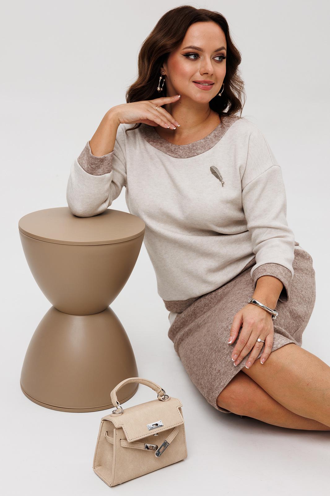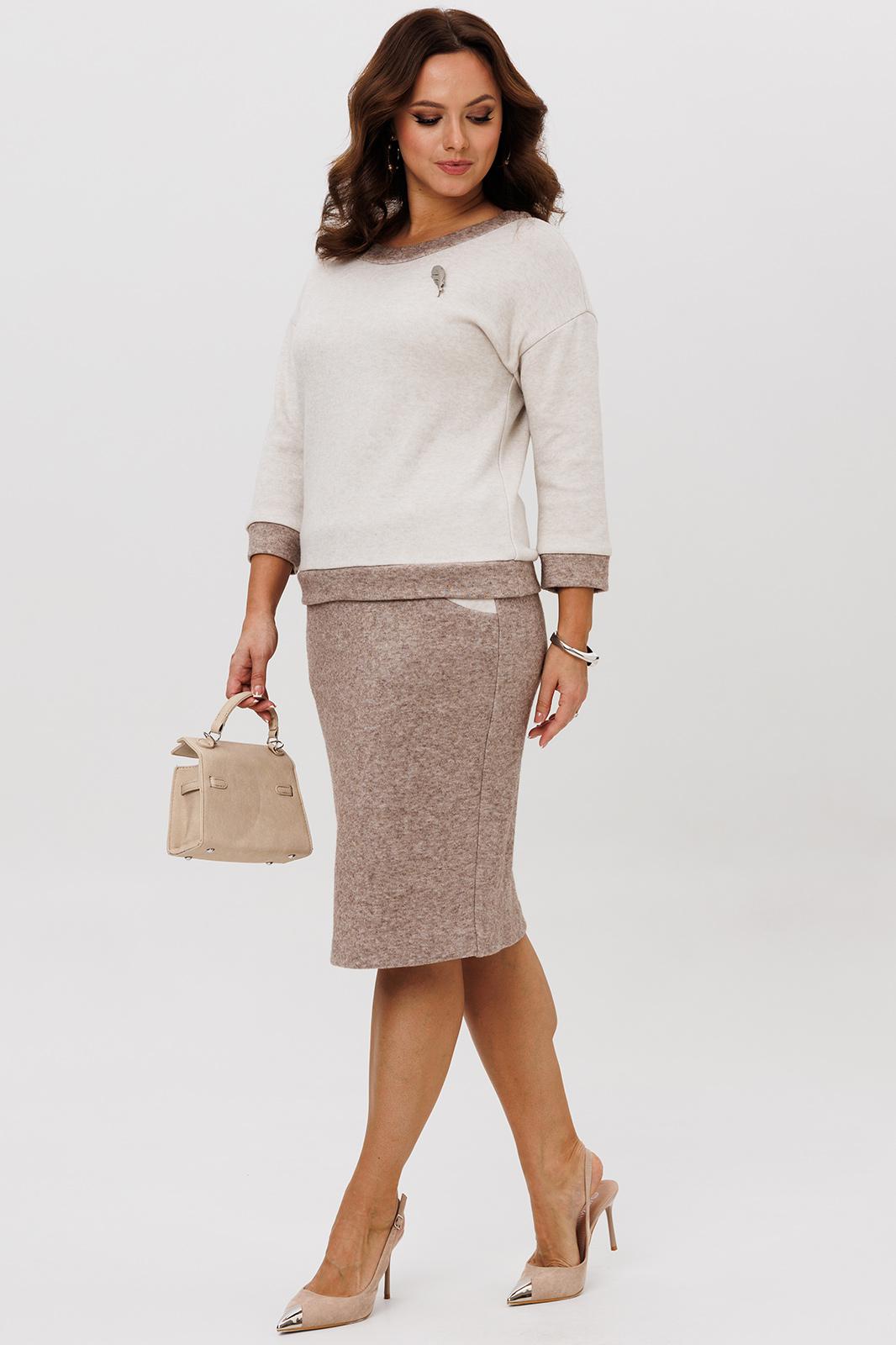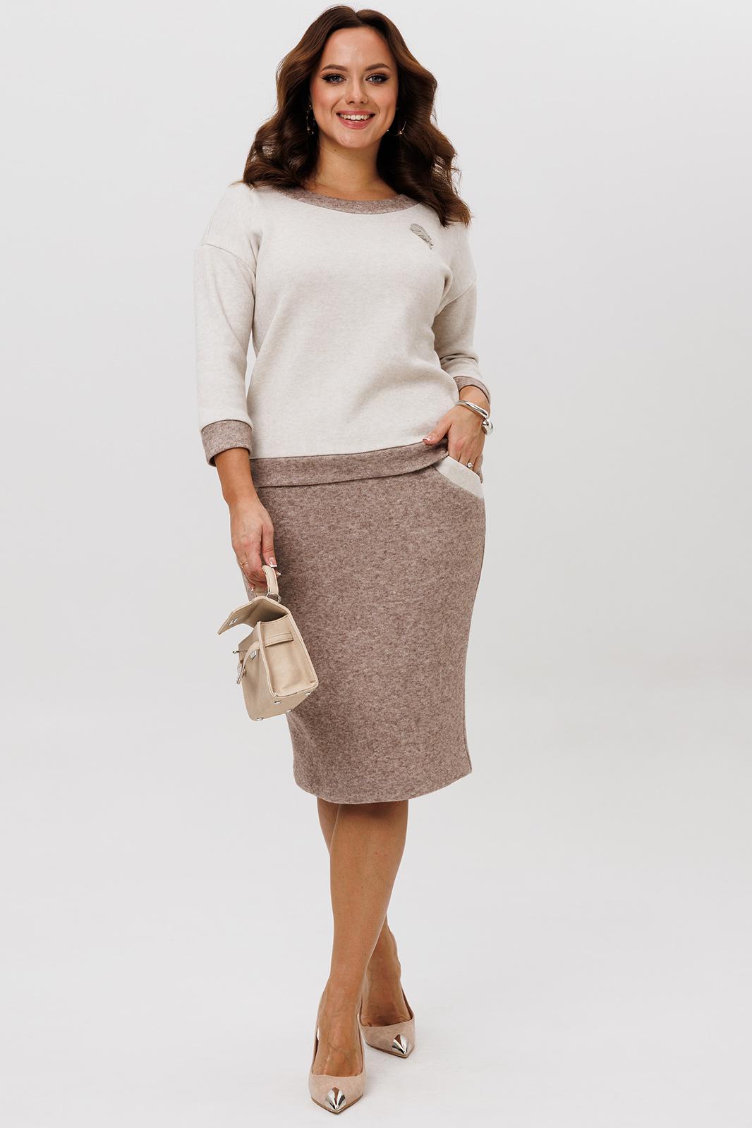 Стильный комплект, состоит из джемпера и юбки , выполнен из мягкой и приятной к телу трикотажной ткани с добавлением натуральных нитей, которые обеспечивают комфорт и тепло в течение всего дня. Данный юбочный костюм идеально подходит как для офиса, так и для неформального повседневного использования.
