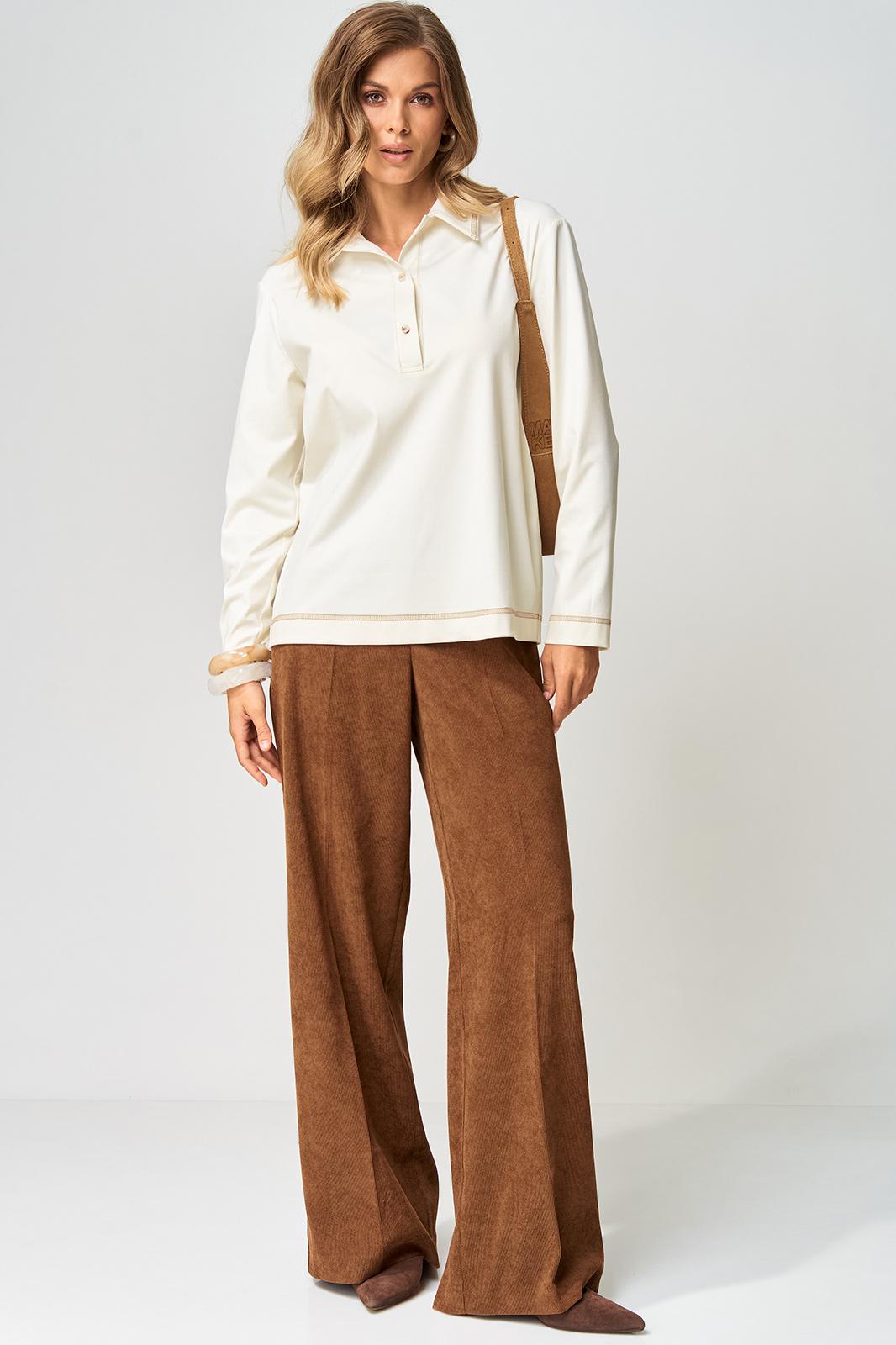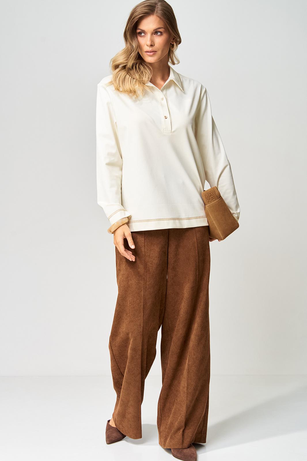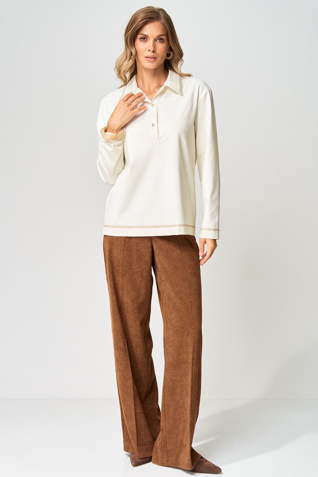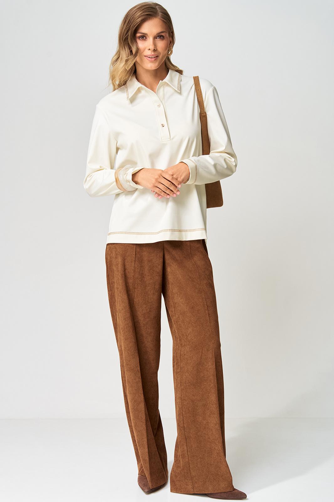 Джемпер прямого силуэта с воротником поло из плотной хлопковой ткани двухнитка. Рукав втачной одношовный. По низу изделия, по низу рукава и по воротнику проложена отделочная строчка. Брюки палаццо с притачным поясом из мягкой вельветовой ткани. Спереди застежка гульфик на молнии и петлей и пуговицей по поясу. По задней частям брюк вытачки. Пояс с резинкой в боковых частях. Брюки с заутюженными стрелками. Длина джемпера- 66 см, длина рукава - 60 см. Длина брюк с учетом пояса - 109 см.