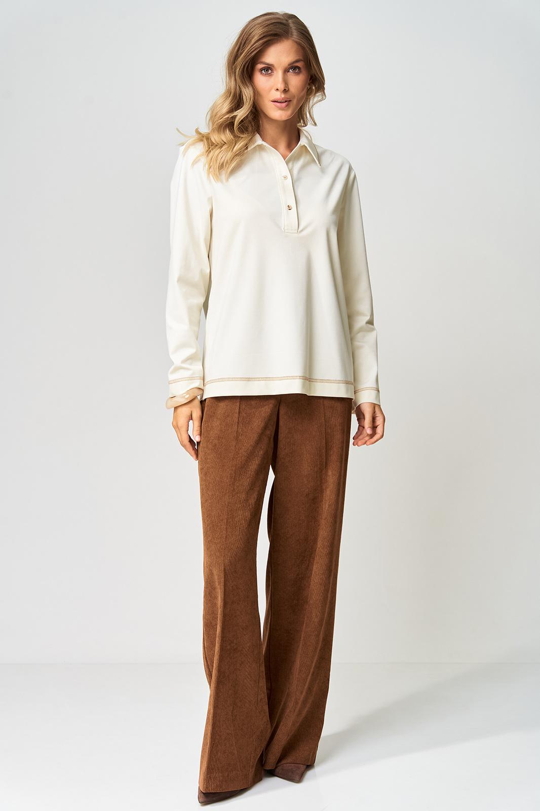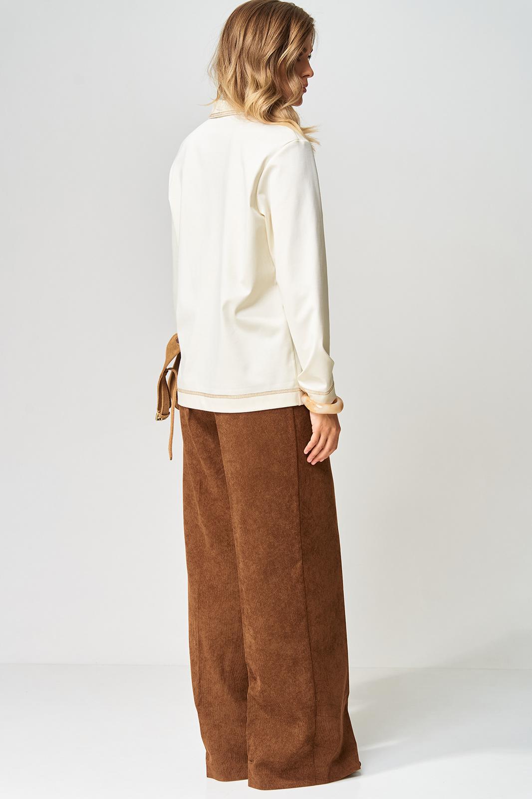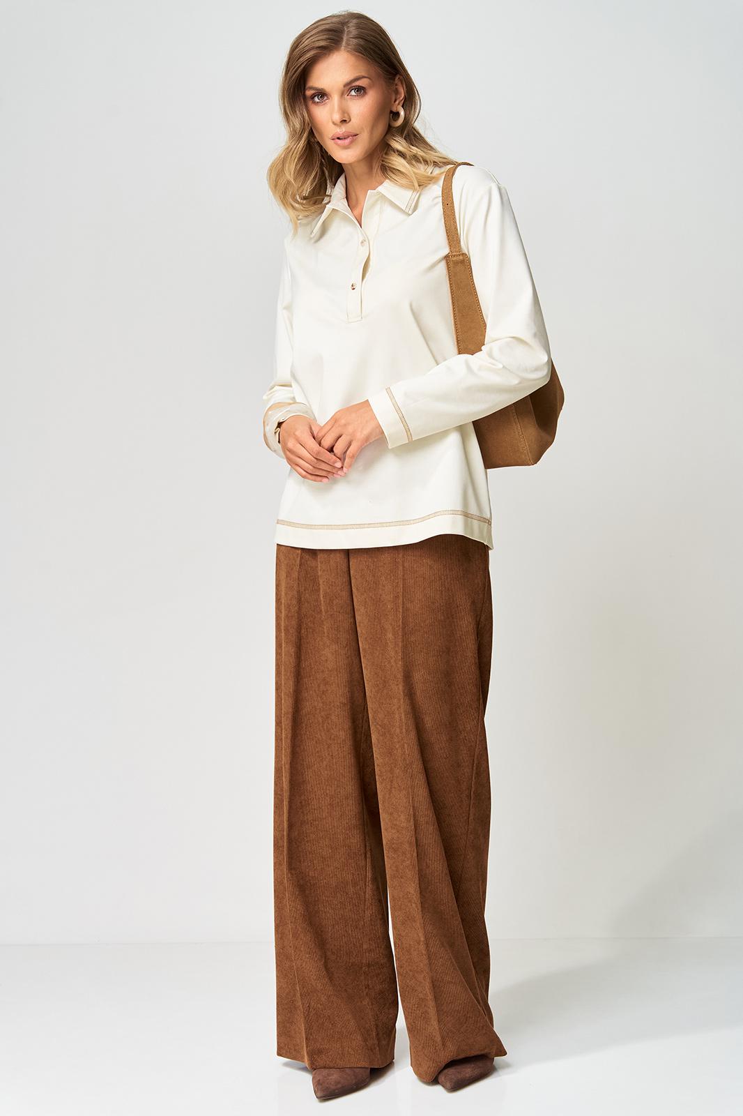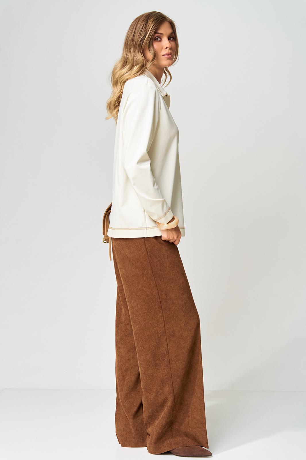 Джемпер прямого силуэта с воротником поло из плотной хлопковой ткани двухнитка. Рукав втачной одношовный. По низу изделия, по низу рукава и по воротнику проложена отделочная строчка. Брюки палаццо с притачным поясом из мягкой вельветовой ткани. Спереди застежка гульфик на молнии и петлей и пуговицей по поясу. По задней частям брюк вытачки. Пояс с резинкой в боковых частях. Брюки с заутюженными стрелками. Длина джемпера- 66 см, длина рукава - 60 см. Длина брюк с учетом пояса - 109 см.