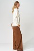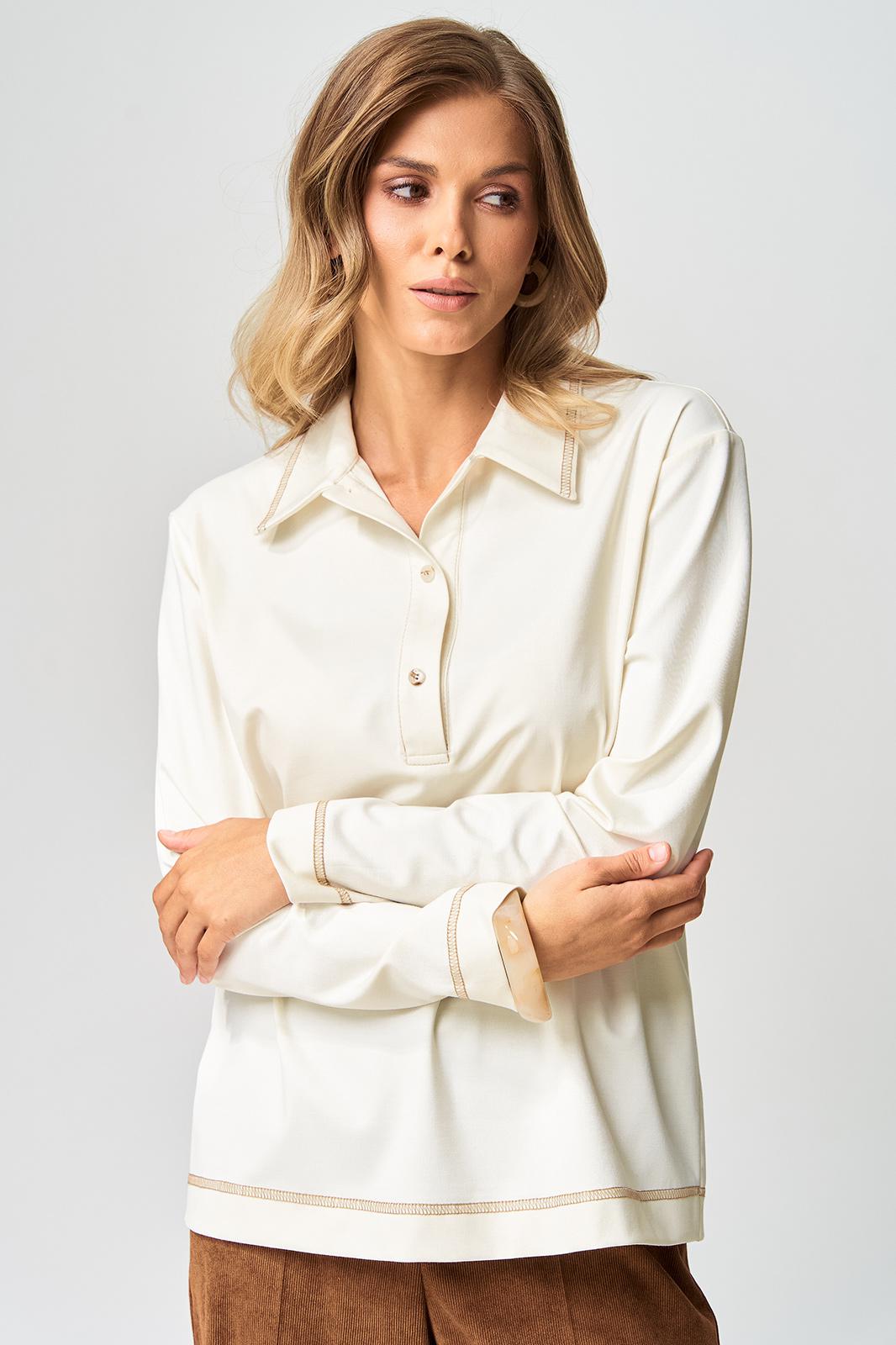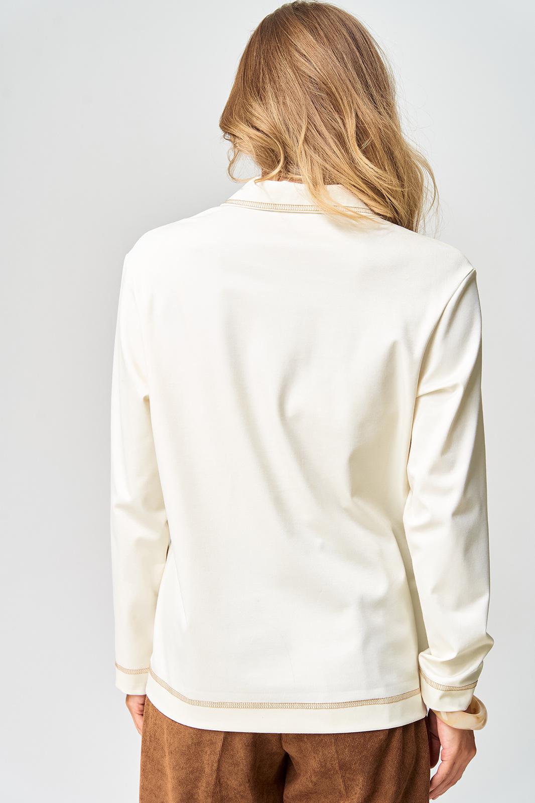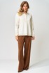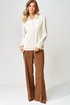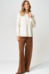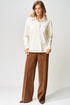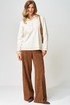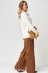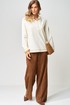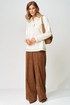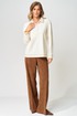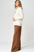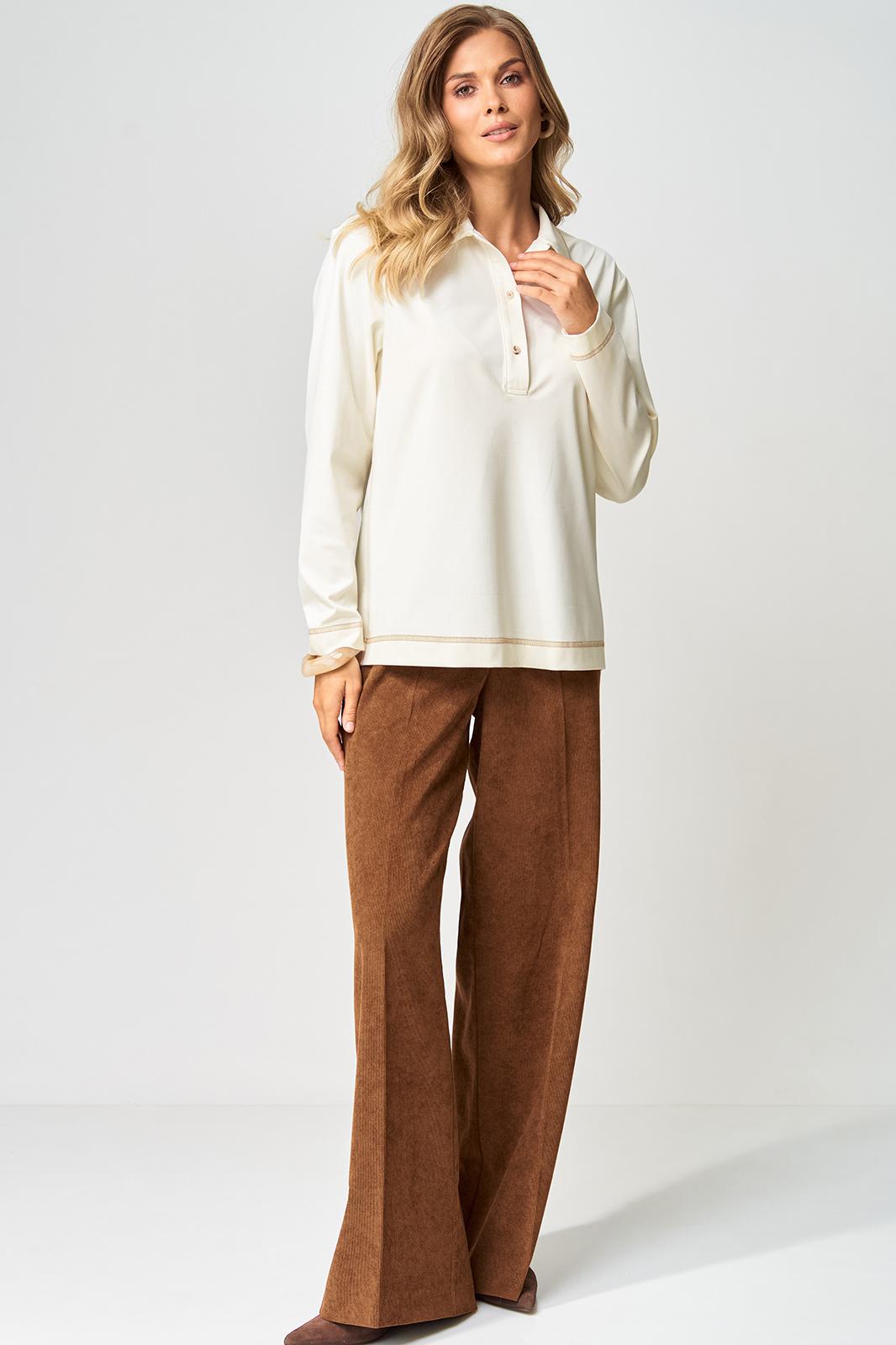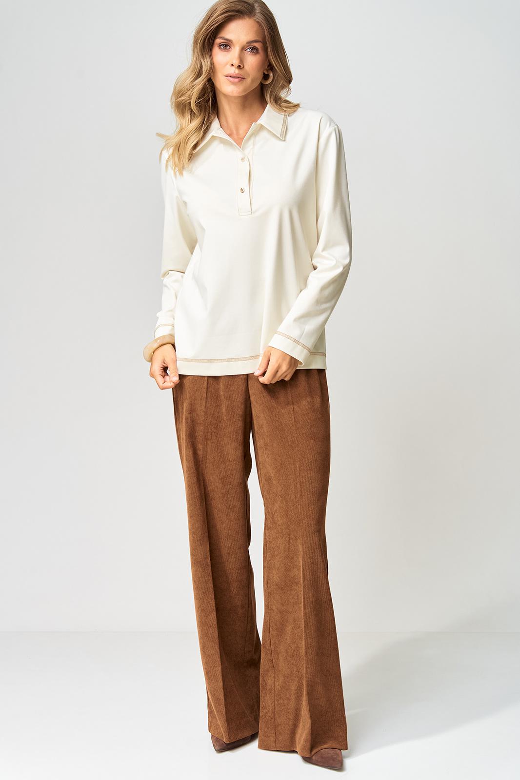 Джемпер прямого силуэта с воротником поло из плотной хлопковой ткани двухнитка. Рукав втачной одношовный. По низу изделия, по низу рукава и по воротнику проложена отделочная строчка. Брюки палаццо с притачным поясом из мягкой вельветовой ткани. Спереди застежка гульфик на молнии и петлей и пуговицей по поясу. По задней частям брюк вытачки. Пояс с резинкой в боковых частях. Брюки с заутюженными стрелками. Длина джемпера- 66 см, длина рукава - 60 см. Длина брюк с учетом пояса - 109 см.