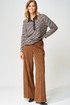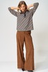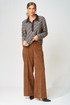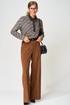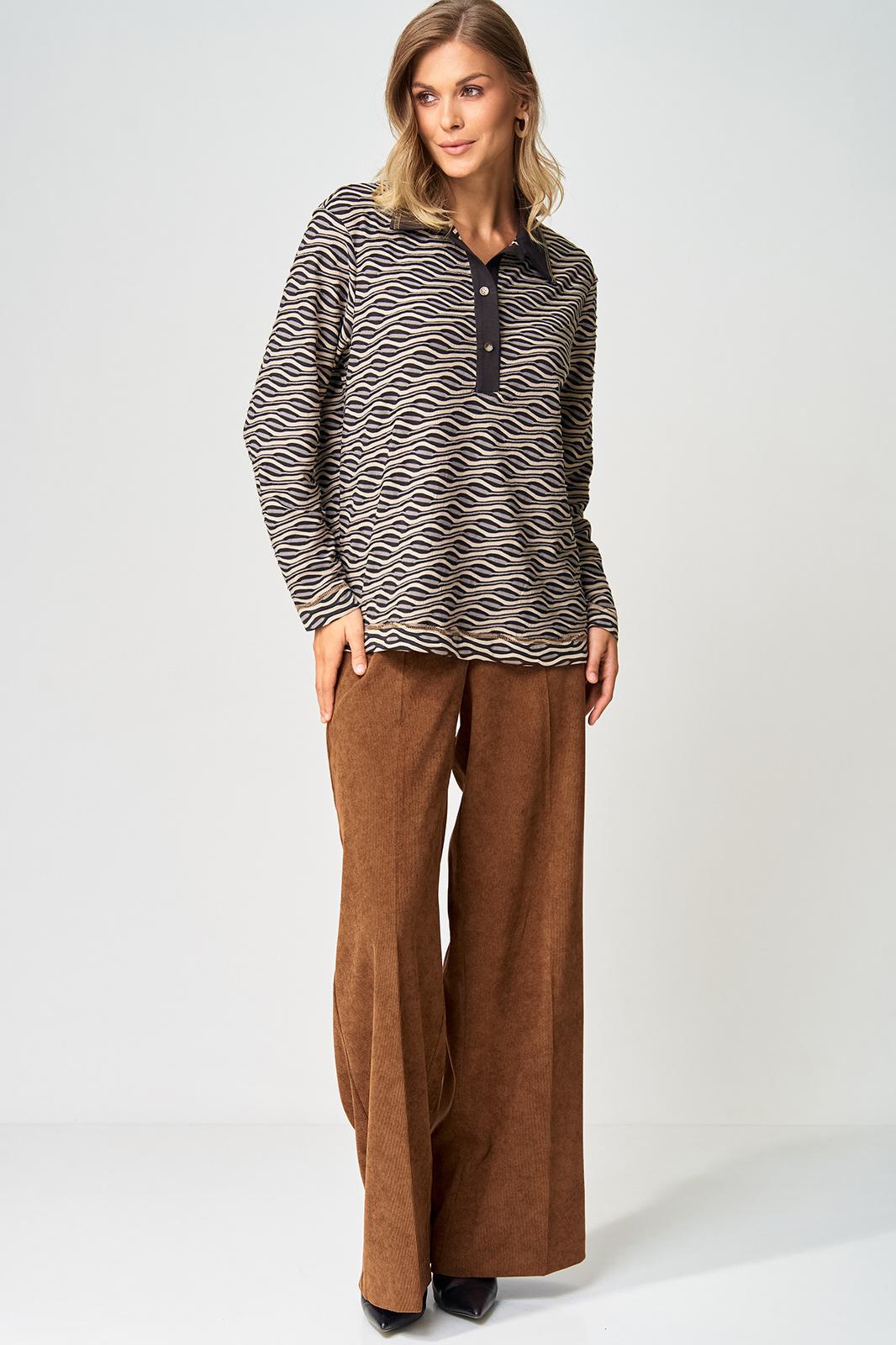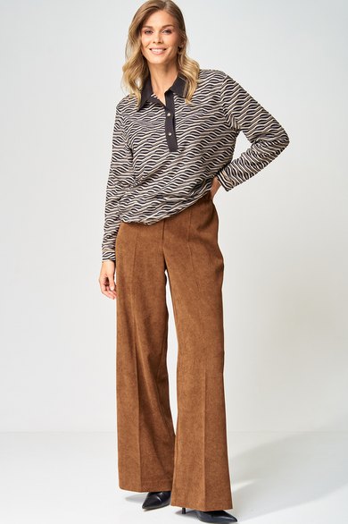 Джемпер прямого силуэта с воротником поло из плотной хлопковой ткани двухнитка. Рукав втачной одношовный. По низу изделия, по низу рукава и по воротнику проложена отделочная строчка. Брюки палаццо с притачным поясом из мягкой вельветовой ткани. Спереди застежка гульфик на молнии и петлей и пуговицей по поясу. По задней частям брюк вытачки. Пояс с резинкой в боковых частях. Брюки с заутюженными стрелками. Длина джемпера- 66 см, длина рукава - 60 см. Длина брюк с учетом пояса - 109 см.
