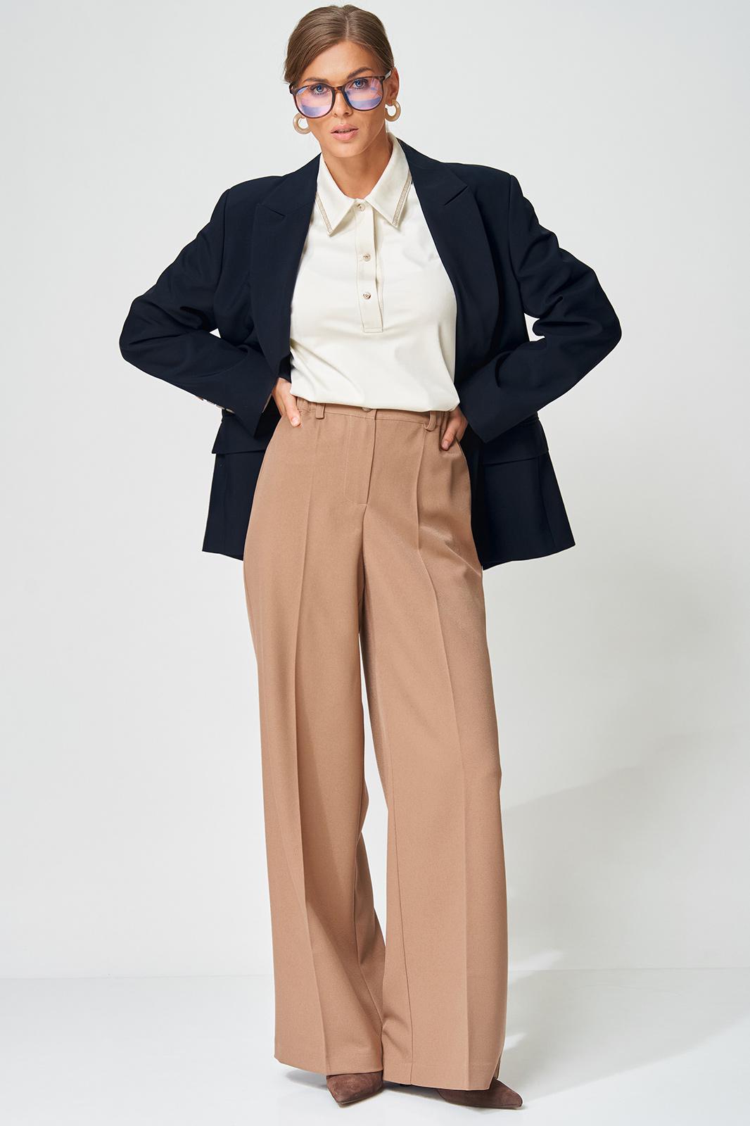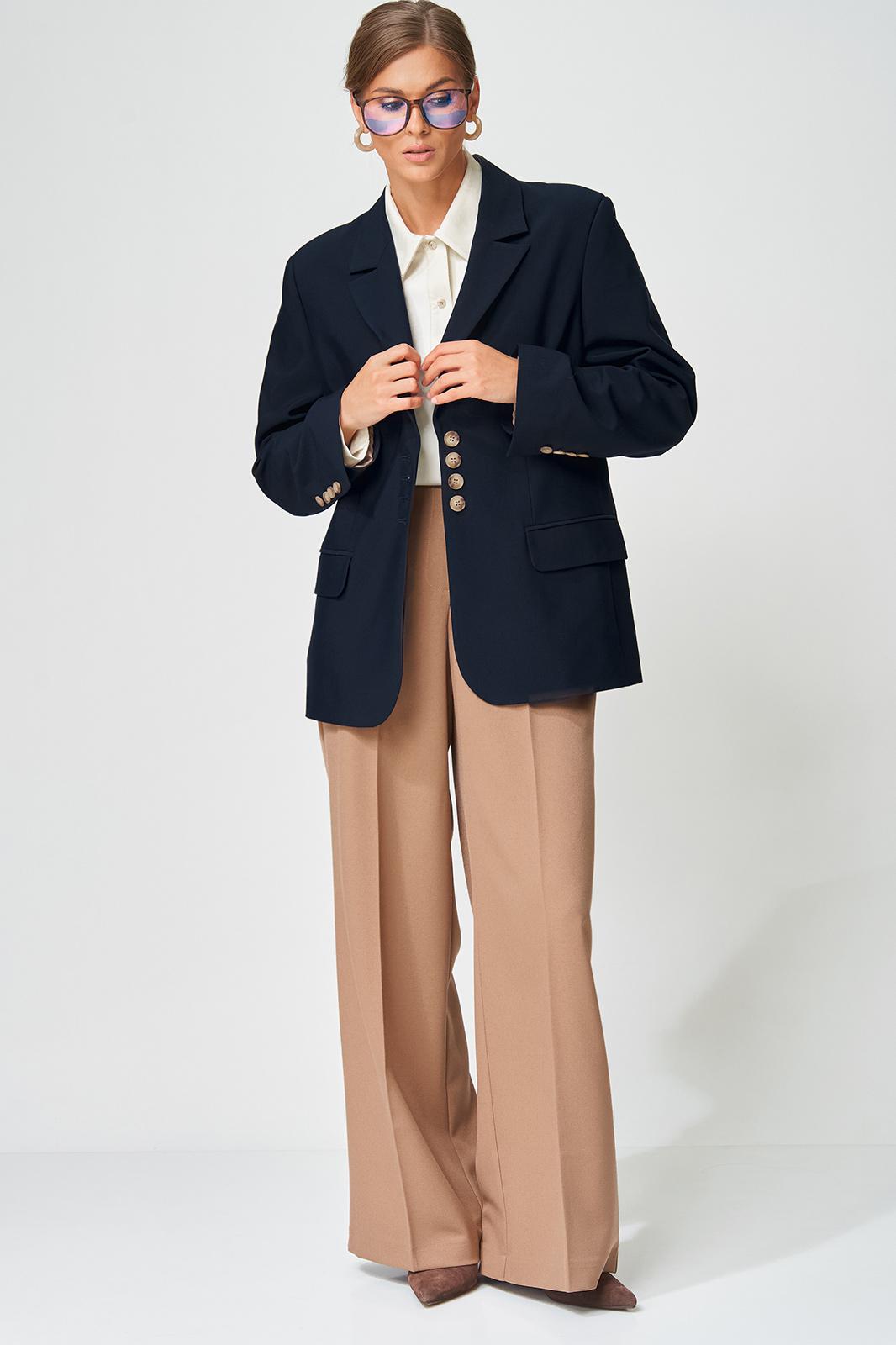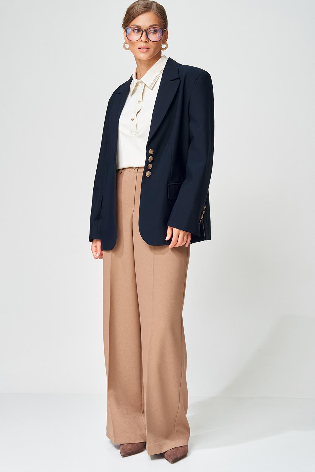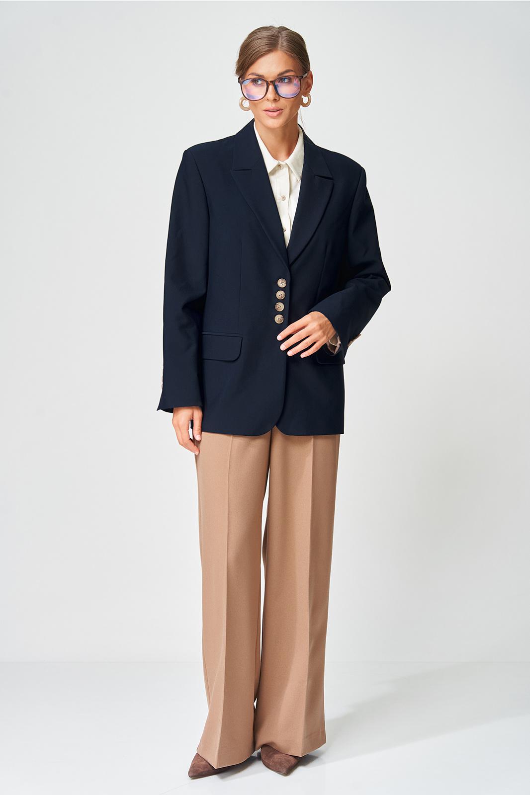 Жакет прямого свободного силуэта оверсайз. Воротник пиджачного типа, застежка обнобортная на 4 петли и пуговицы. Перед с талиевой вытачкой и карманом с клапаном в рамку, с рельефом. Спинка со средним швом и рельефами, в рельефах шлица. Рукав втачной одношовный со шлицей и 4-мя пуговицами. Жакет на подкладке. Брюки расширенные книзу с притачным поясом выполнены из костюмной ткани средней плотности. В поясе по бокам вставлена резинка. По передней и задней частям брюк вытачки и заутюжены стрелки. Спереди застежка гульфик на молнии и пуговицей на поясе. Фурнитура может быть изменена с сохранением художественного образа. Длина жакета- 70 см, длина рукава жакета - 60 см, длина брюк по боковому шву без учета пояса- 106 см.