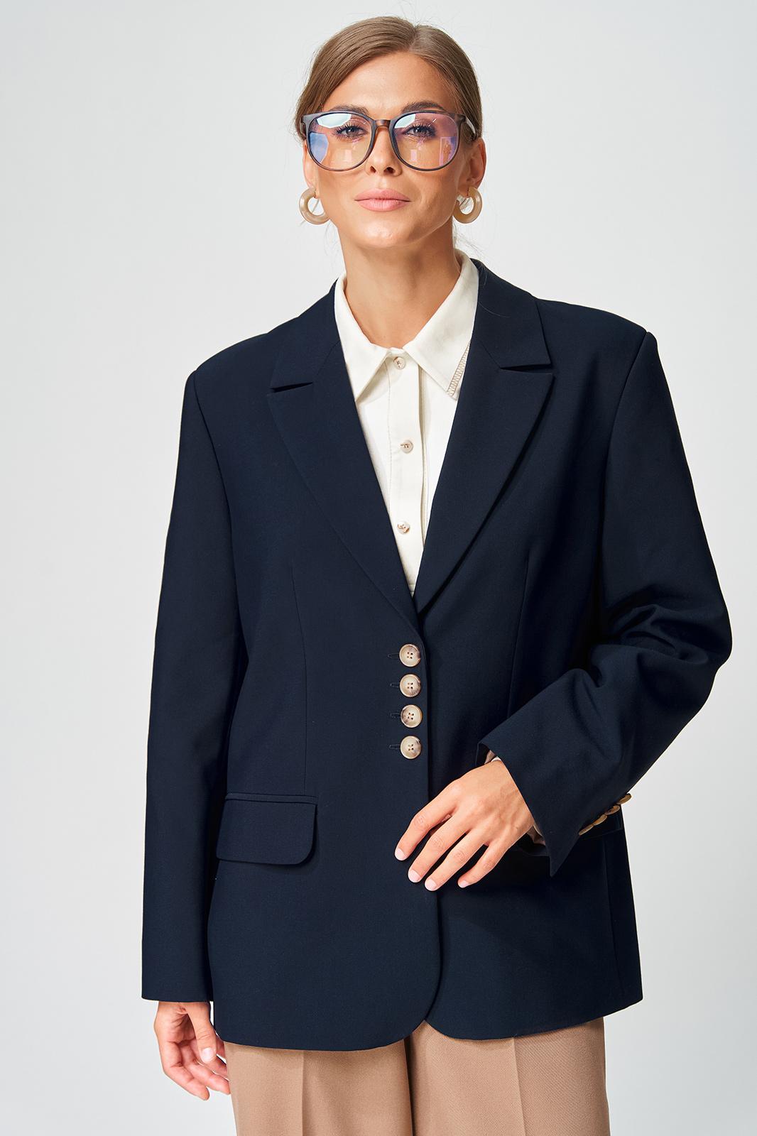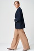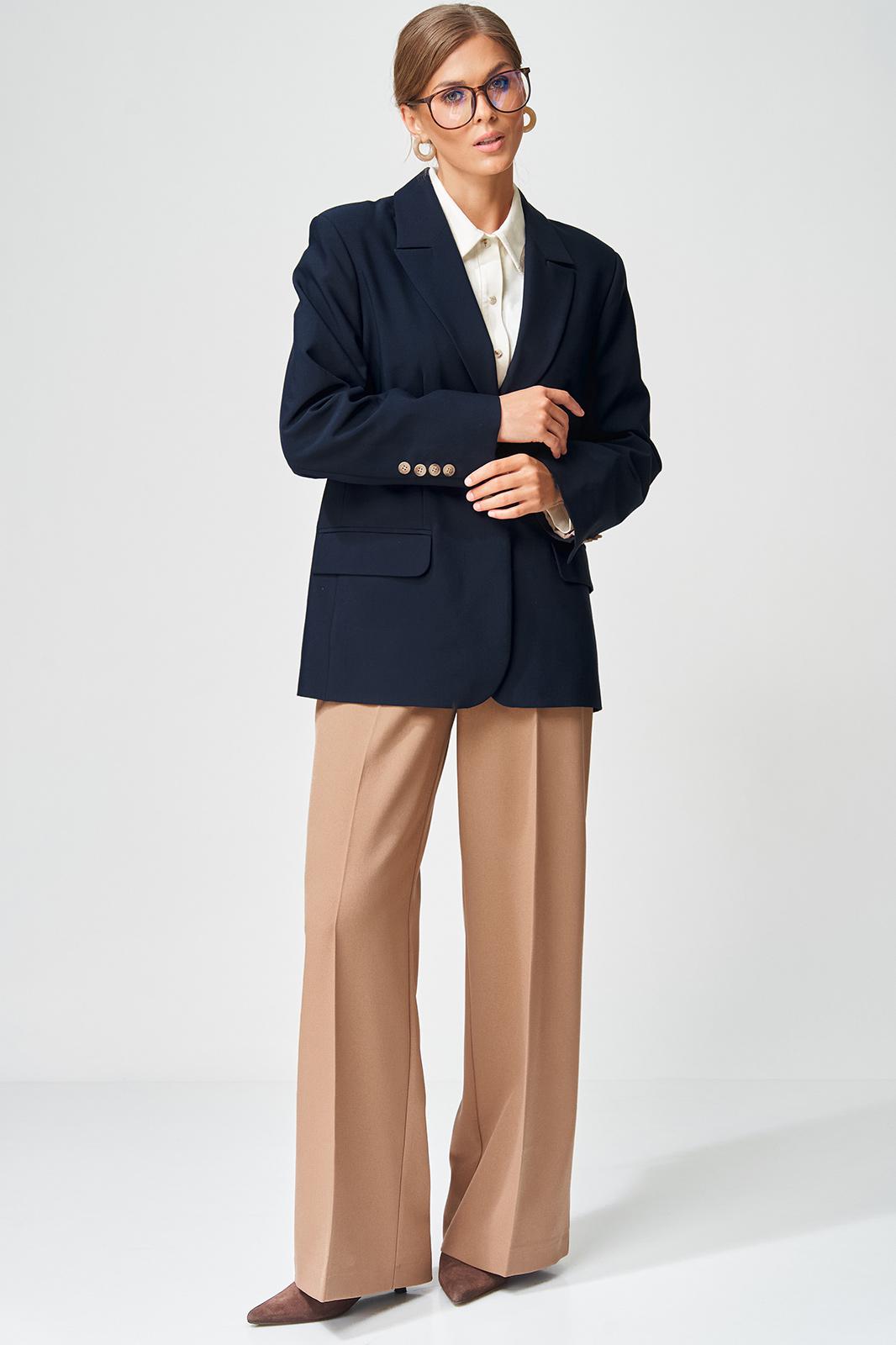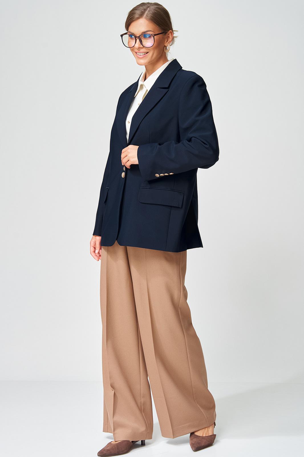 Жакет прямого свободного силуэта оверсайз. Воротник пиджачного типа, застежка обнобортная на 4 петли и пуговицы. Перед с талиевой вытачкой и карманом с клапаном в рамку, с рельефом. Спинка со средним швом и рельефами, в рельефах шлица. Рукав втачной одношовный со шлицей и 4-мя пуговицами. Жакет на подкладке. Брюки расширенные книзу с притачным поясом выполнены из костюмной ткани средней плотности. В поясе по бокам вставлена резинка. По передней и задней частям брюк вытачки и заутюжены стрелки. Спереди застежка гульфик на молнии и пуговицей на поясе. Фурнитура может быть изменена с сохранением художественного образа. Длина жакета- 70 см, длина рукава жакета - 60 см, длина брюк по боковому шву без учета пояса- 106 см.