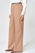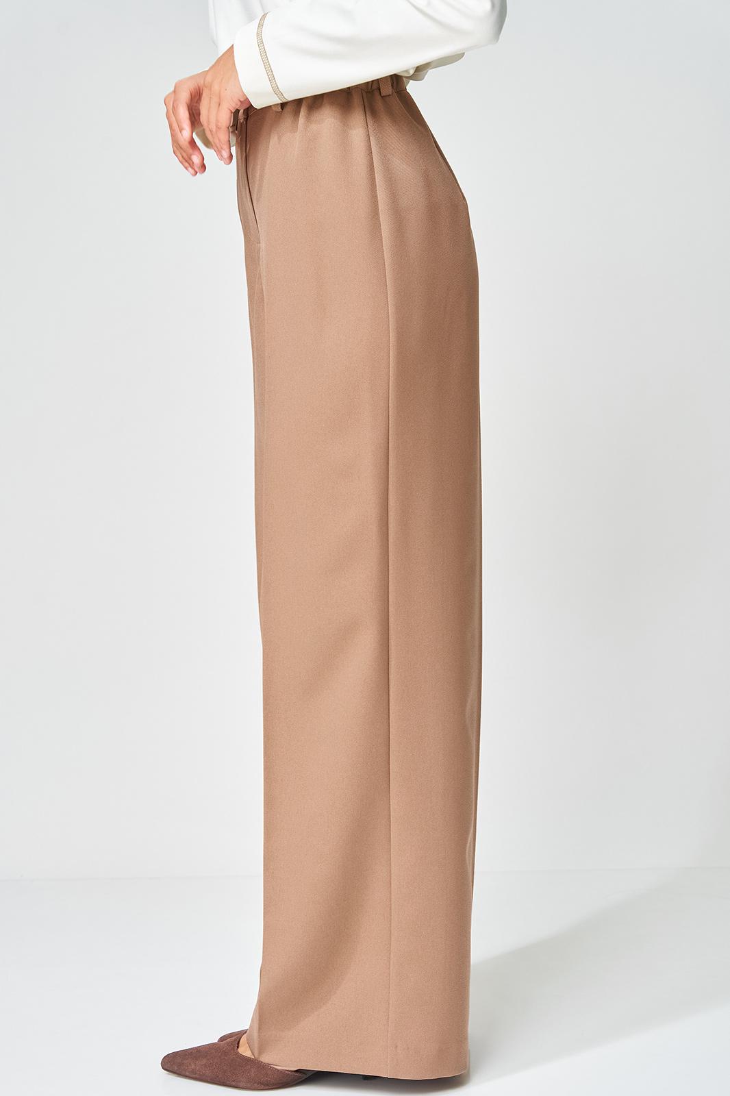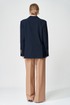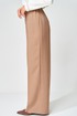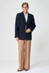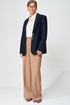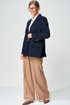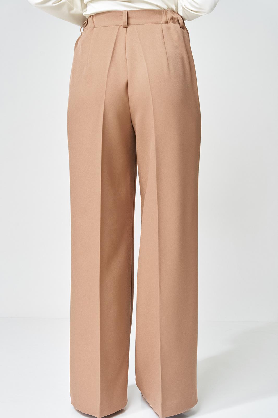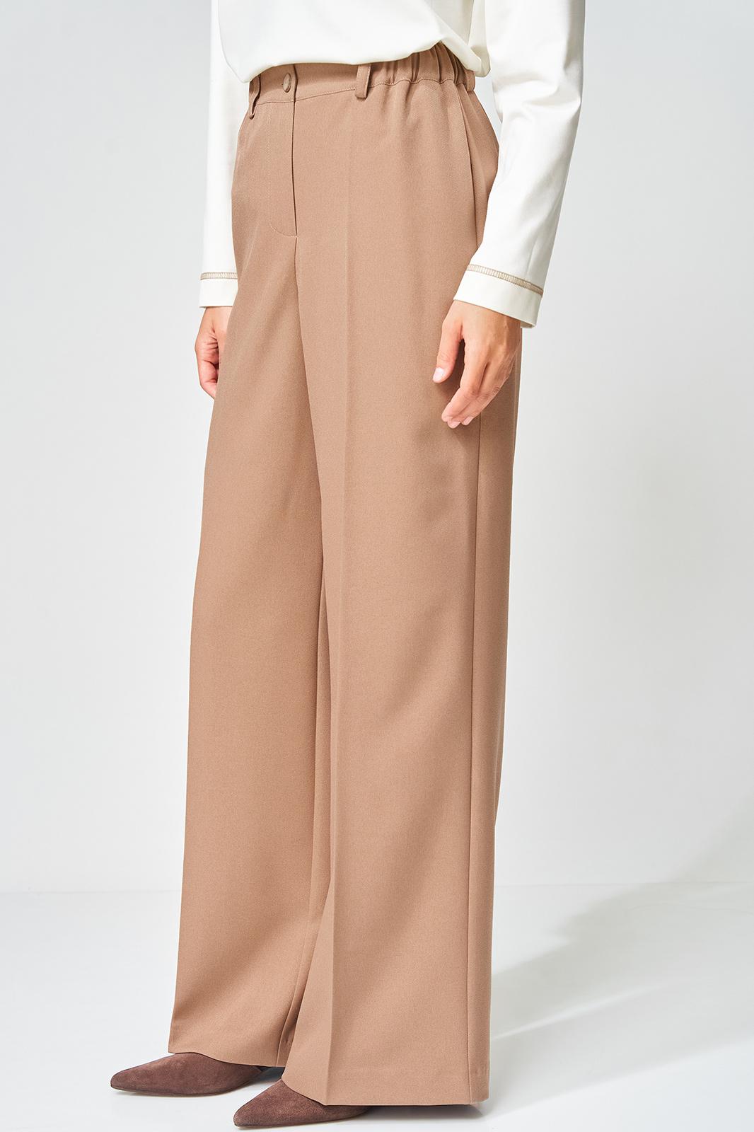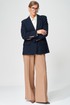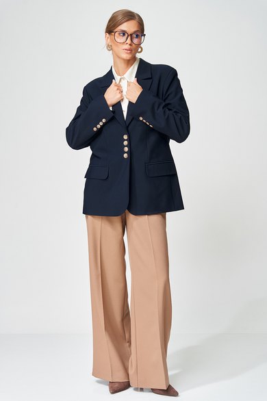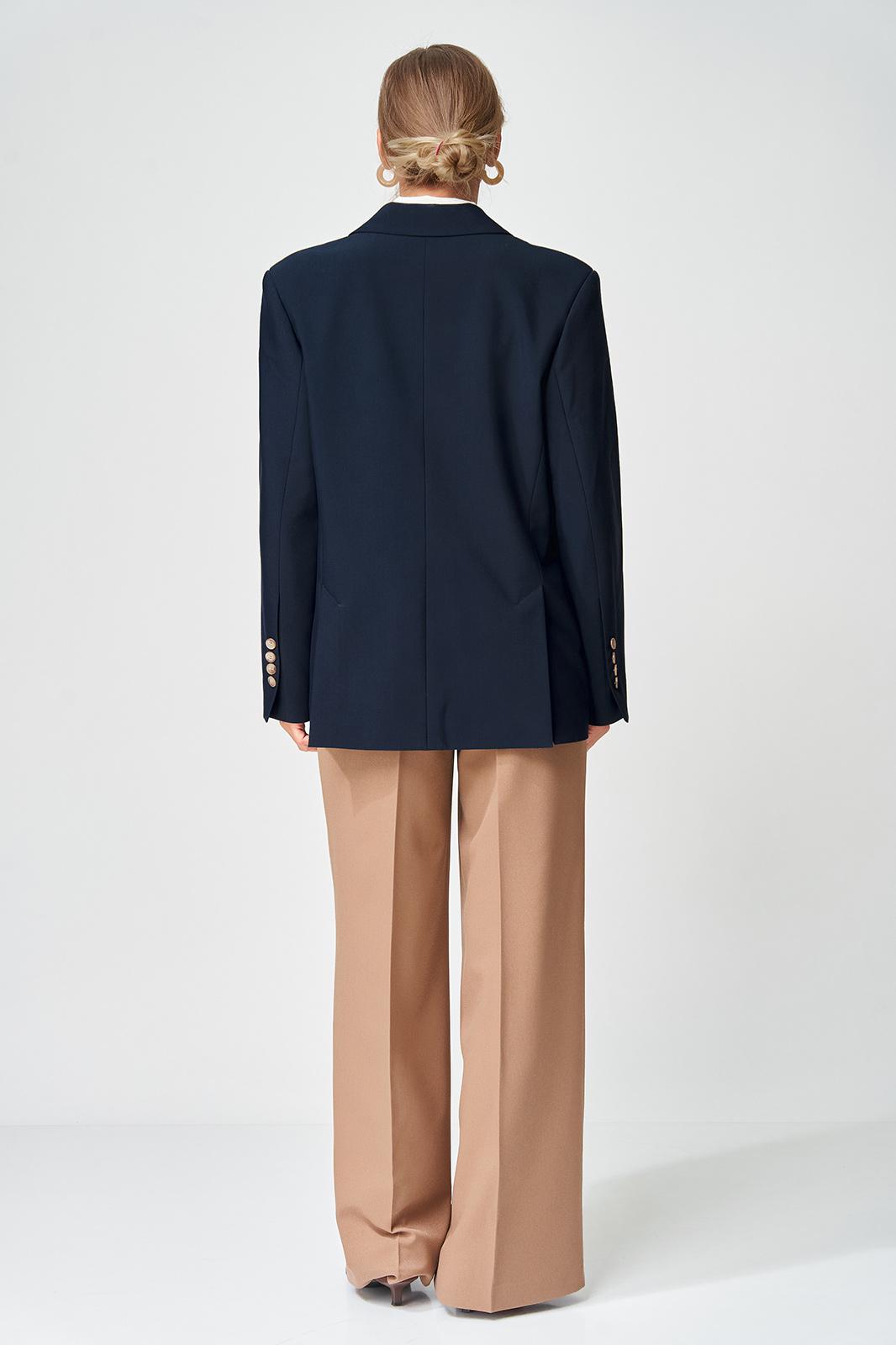 Жакет прямого свободного силуэта оверсайз. Воротник пиджачного типа, застежка обнобортная на 4 петли и пуговицы. Перед с талиевой вытачкой и карманом с клапаном в рамку, с рельефом. Спинка со средним швом и рельефами, в рельефах шлица. Рукав втачной одношовный со шлицей и 4-мя пуговицами. Жакет на подкладке. Брюки расширенные книзу с притачным поясом выполнены из костюмной ткани средней плотности. В поясе по бокам вставлена резинка. По передней и задней частям брюк вытачки и заутюжены стрелки. Спереди застежка гульфик на молнии и пуговицей на поясе. Фурнитура может быть изменена с сохранением художественного образа. Длина жакета- 70 см, длина рукава жакета - 60 см, длина брюк по боковому шву без учета пояса- 106 см.