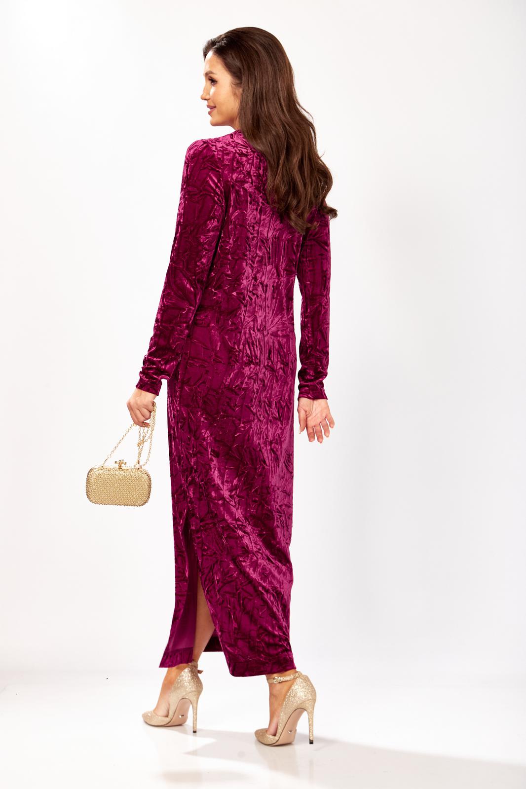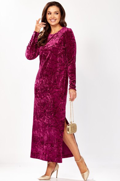 Платье прямого силуэта из бархата. В боковом шве разрез. Рукав втачной одношовный. По спинке застежка капелька на петлю и пуговицу. Длина платья - 136 см, длина рукава - 66 см.