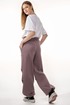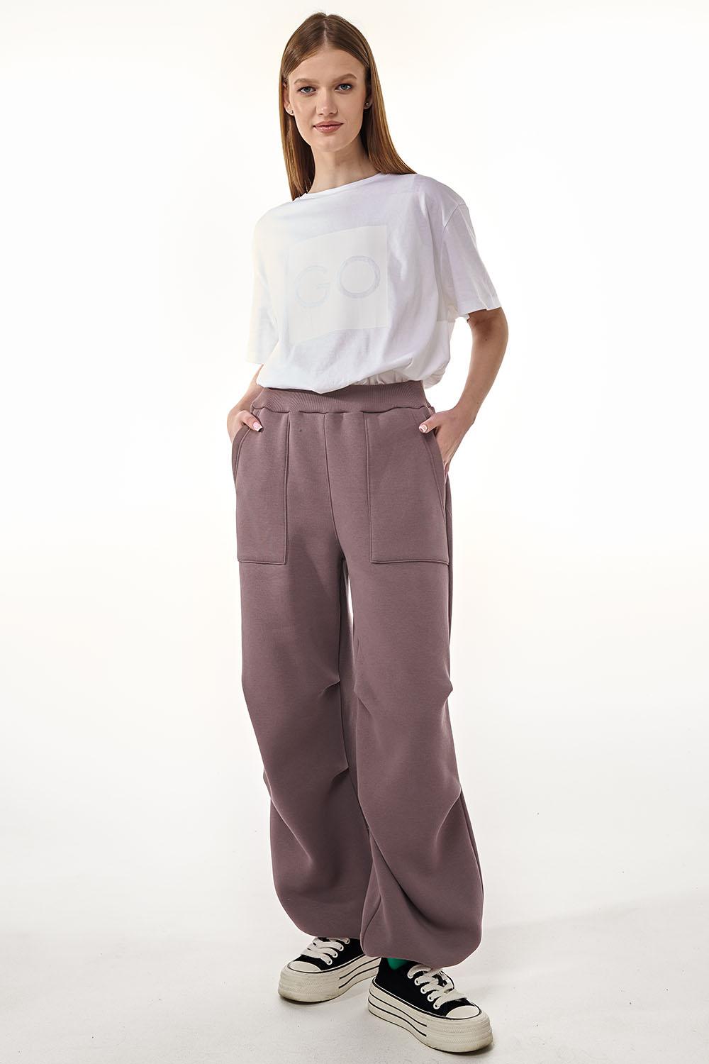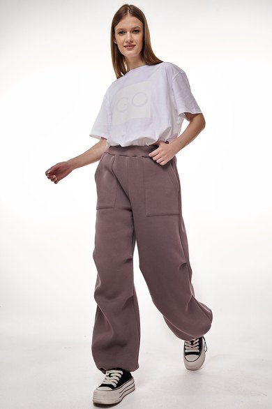 Современные комфортные брюки карго, выполнены из футера с начесом. Брюки расширенные к низу, с возможностью заузить и зафиксировать ширину внизу (низ имеет кулиску с резинкой и фиксатором). На передних половинках брюк удобные накладные карманы, складки в районе линии колен. Пояс из ткани компаньена кошкорсе со шнуром и резинкой внутри.