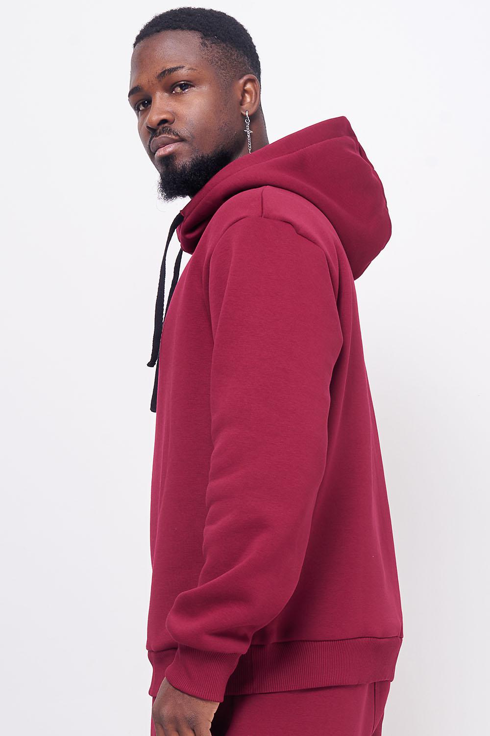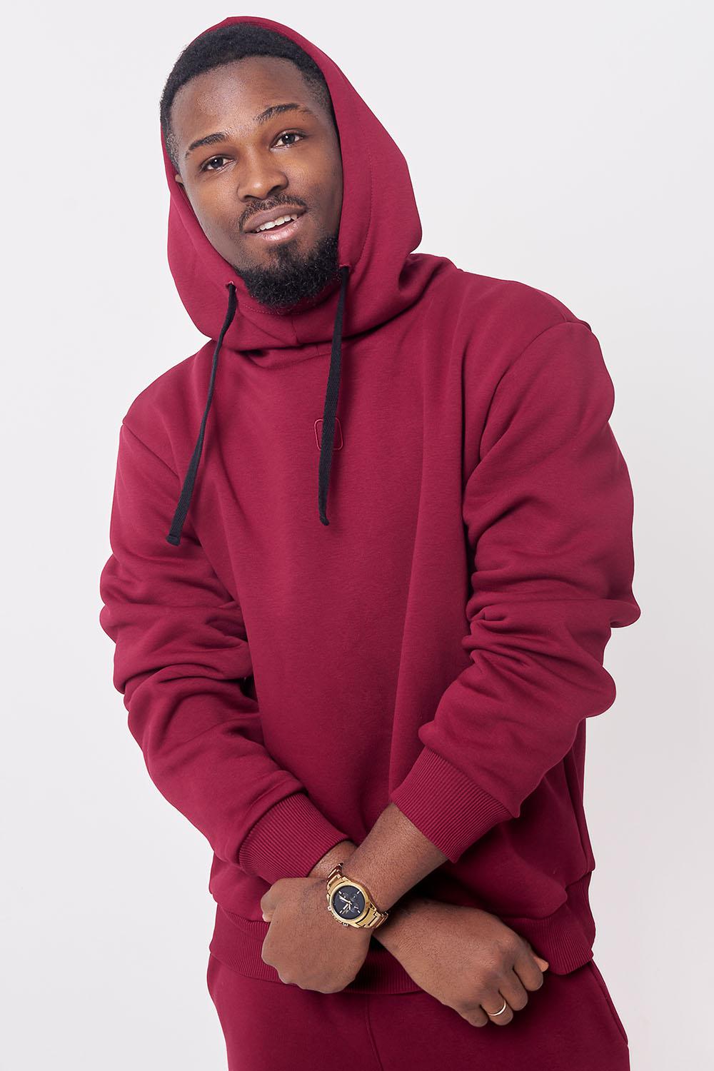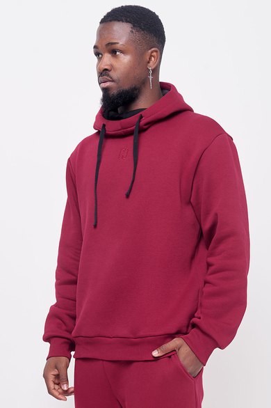 Худи мужской повседневный, спортивного стиля из тёплой ткани (футера тринитки с начёсом). Манжеты рукавов и планка по низу изделия выполнены из ткани-компаньена (кашкорсе) в цвет основной ткани. Худи с двойным капюшоном с кулисой по краю и шнурком внутри. Внутренний капюшон из контрастного вискозного трикотажного полотна. Капюшон служит вместо воротника-шарфа, укрывая от ветра и холода. На переде вышивка-логотип в цвет ткани.