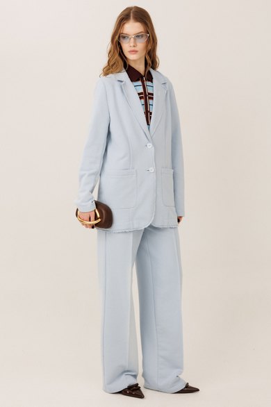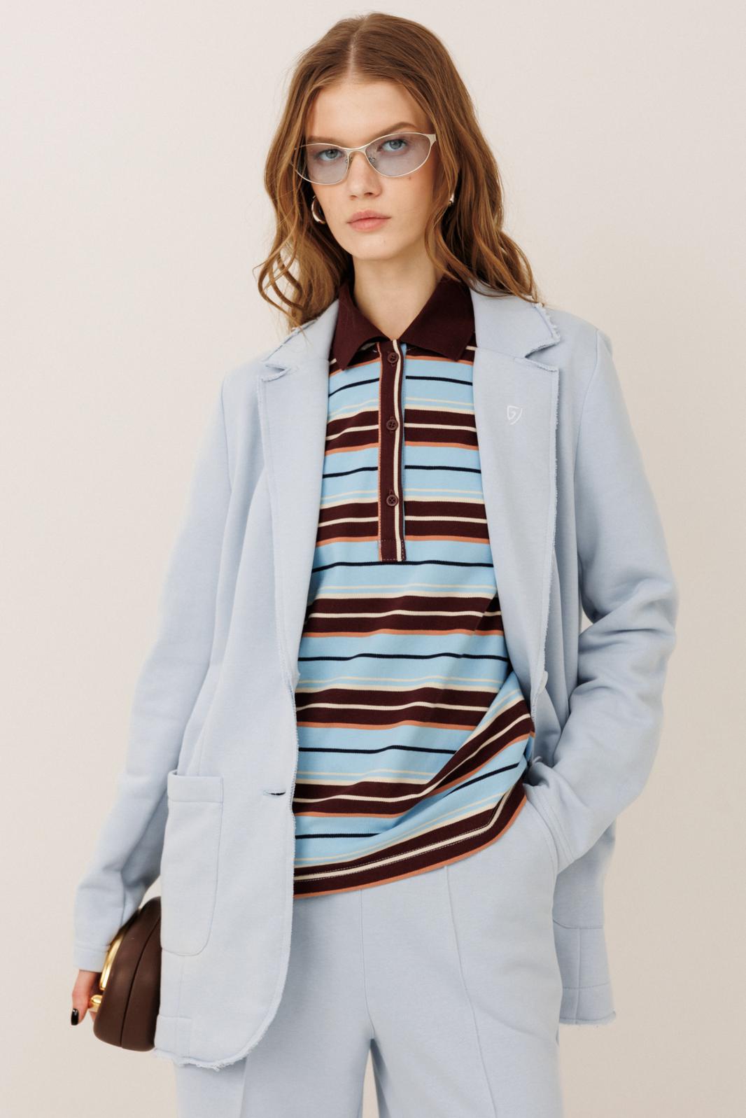 Костюм Gowear из футера в стиле smart casual поможет создать в меру строгий и одновременно расслабленный образ. Костюм состоит из жакета и прямых брюк. Жакет прямого силуэта с воротником и лацканами, имеет удобные карманы и застежку на 2 пуговицы. На левом лацкане вышивка-логотип в контрастном цвете. Низ и борта имеют открытые края (эффект необработанного шва), укреплены дополнительной строчкой. Жакет без подкладки. Брюки прямые. На передних половинках - отделочная строчка по стрелкам и удобные боковые карманы. Пояс из ткани кошкорсе, с резинкой и контрастным шнурком.