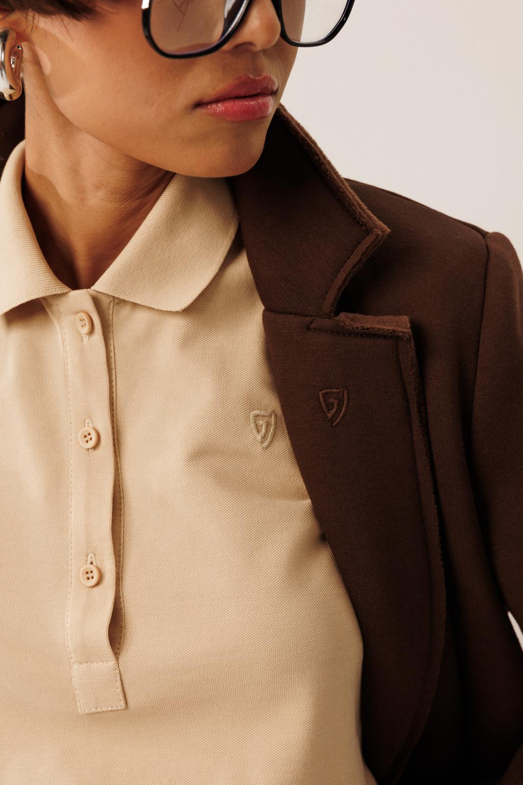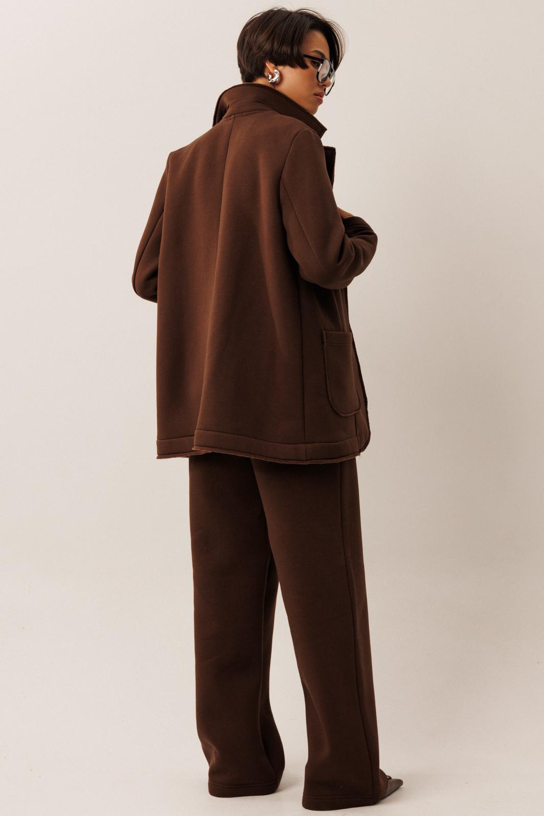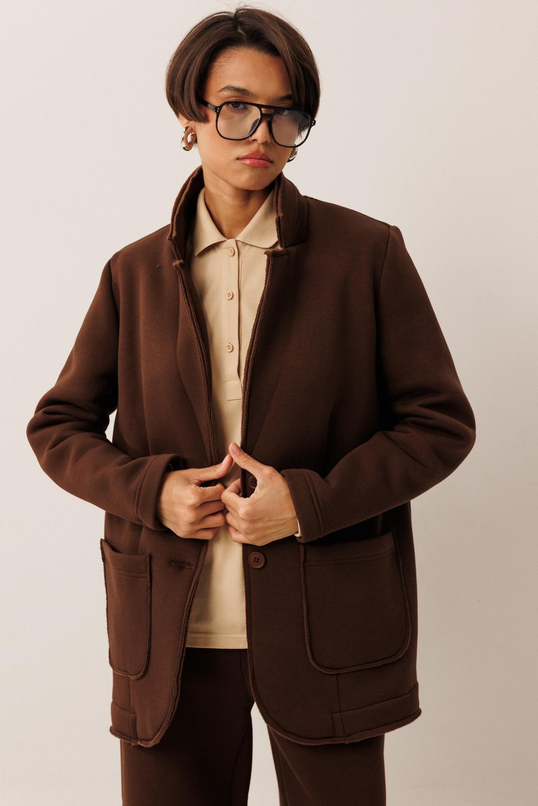 Жакет прямого силуэта с пиджачным воротником, имеет удобные накладные карманы и застежку на 2 пуговицы. На левом лацкане вышивка-логотип в цвет ткани. Низ и борта имеют открытые края (эффект необработанного шва), укреплены дополнительной строчкой. Жакет без подкладки.