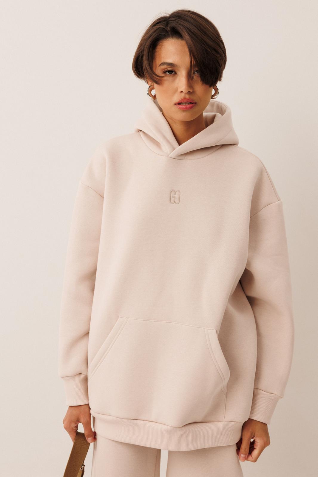 Худи имеет двойной капюшон и карман кенгуру. По центру переда вышивка-логотип в цвет ткани. Рукава имеют притачную манжету. Манжеты рукавов и низ изделия выполнены из ткани- компаньона кошкорсе.
