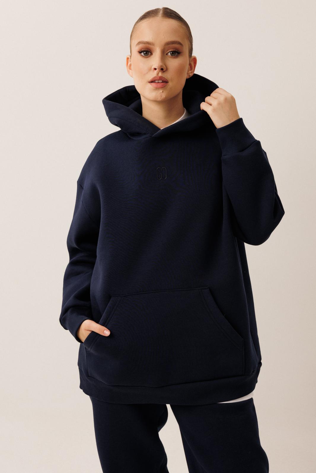 Худи имеет двойной капюшон и карман кенгуру. По центру переда вышивка-логотип в цвет ткани. Рукава имеют притачную манжету. Манжеты рукавов и низ изделия выполнены из ткани- компаньона кошкорсе.